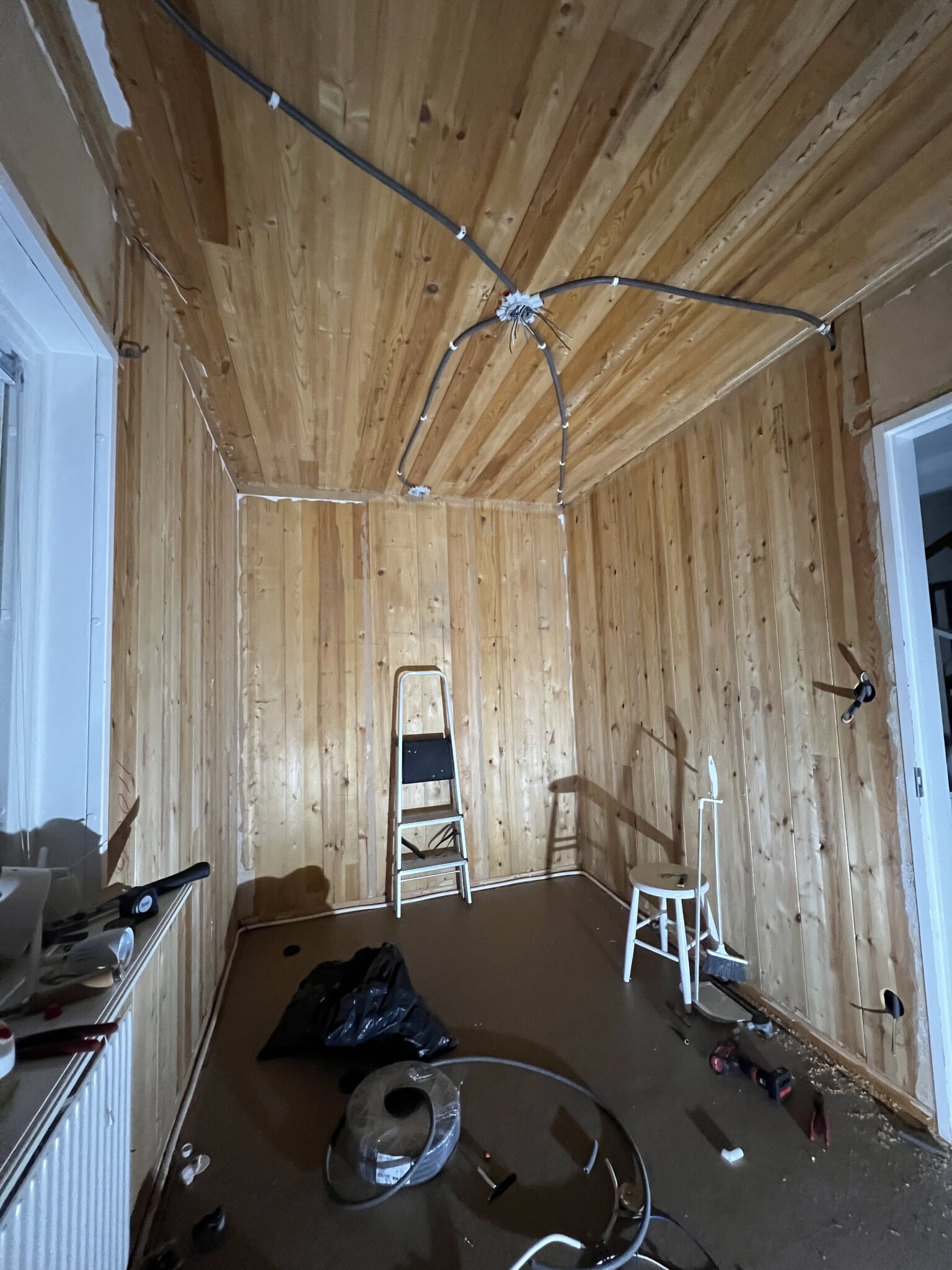 Två uttag bredvid elementet återstår att fixa imorgon, jobbigt med spånen från ytterväggen som väller ut. 😬