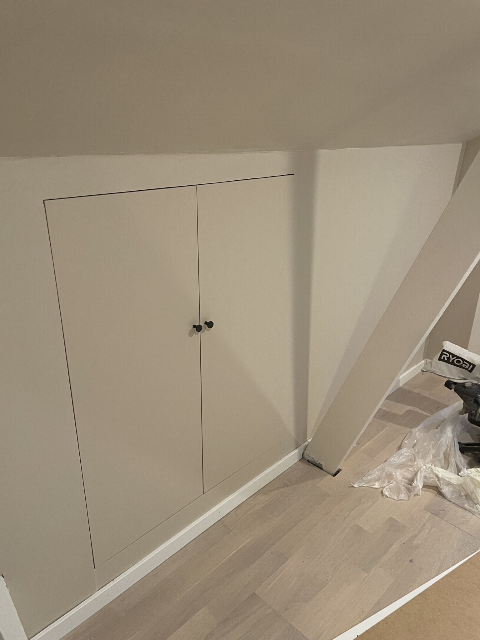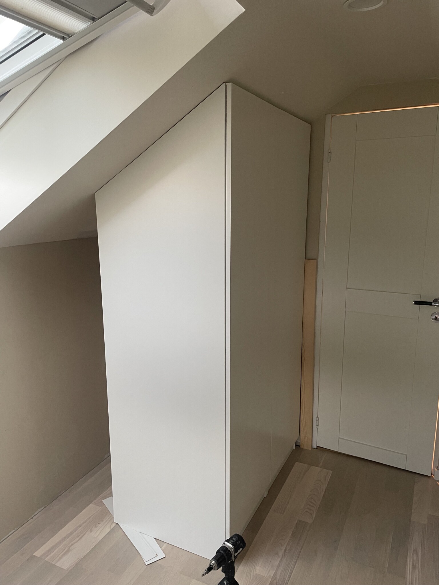 Första steget för att bygga upp modet var att få till infällda metodluckor till sidovinden. Det gick rätt ok så nu testar vi hela garderoben. För ännu högre snitsighet hade man kunnat gersåga överkanten av stommen och dörrarna också för att följa taket men vi kände att det blev good enough med rakt snitt. Mot stommen kommer det som sagt täckskiva på sidan och mjukfog för taket är inte exakt