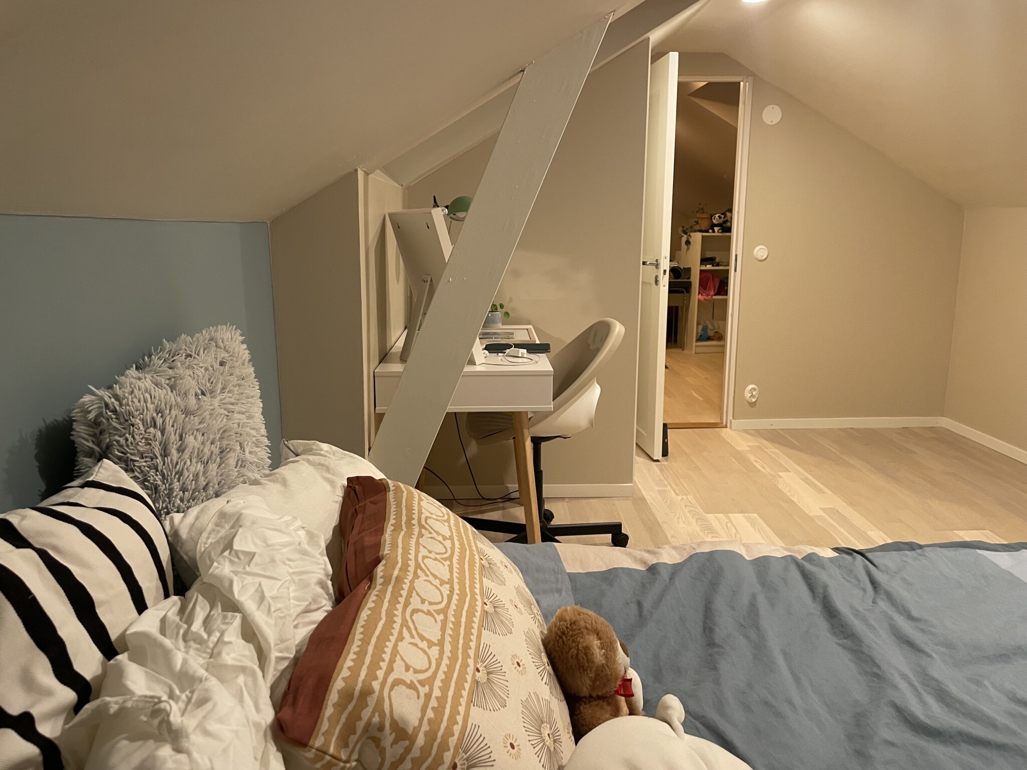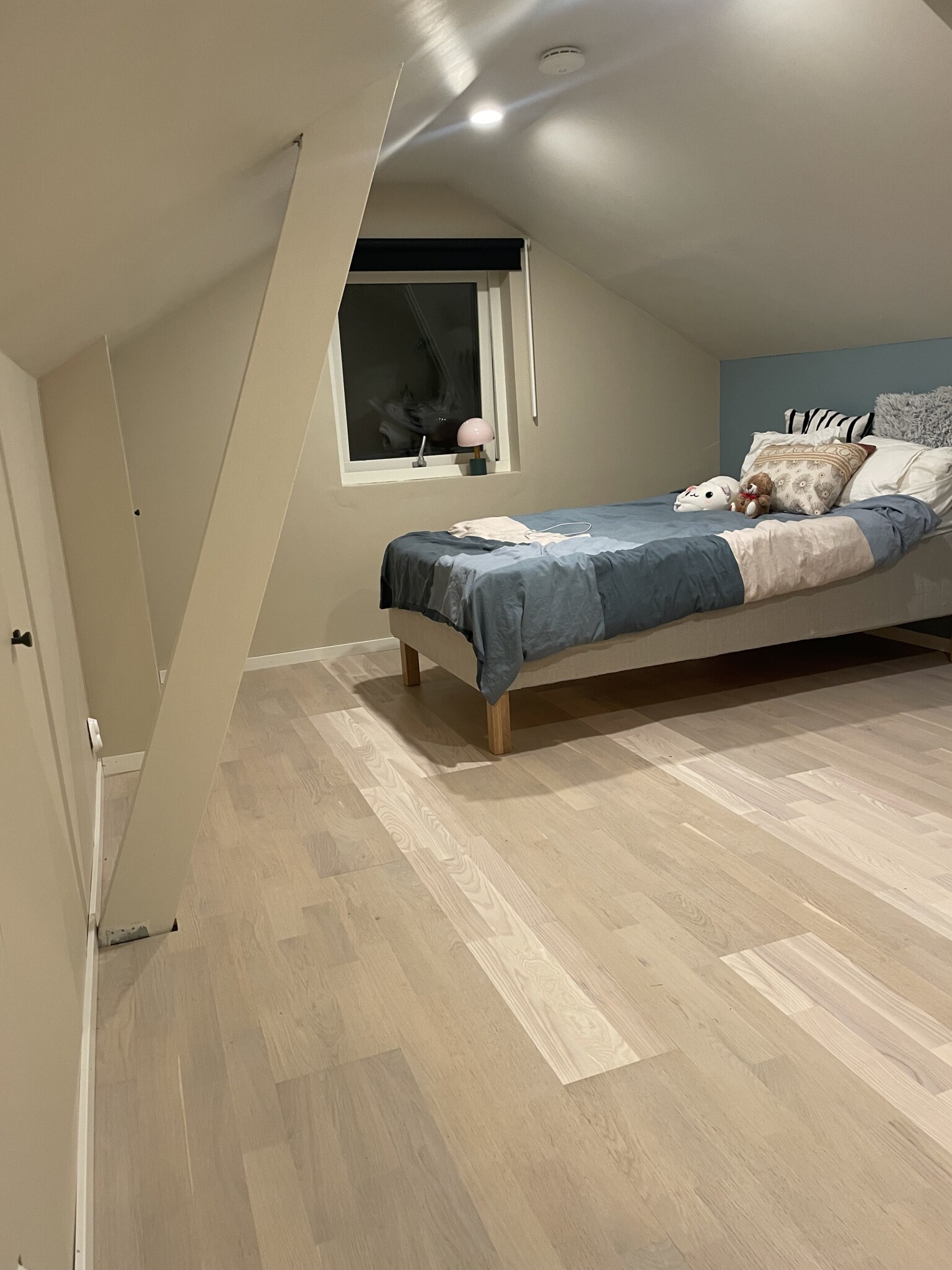 Tonårsrummet äntligen klart för inflytt. Tonåringen själv pös lämpligen iväg när det var dags att bära upp möblerna från gamla rummet så ska tillkomma en del inkl matta för oj vad tydligt brädorna från nya paketet parkett syns på bilderna. IRL så visst kan man se en nyansskillnad men inte alls så skarpt. De andra har legat 3år. Solbleks nog en del över tid.