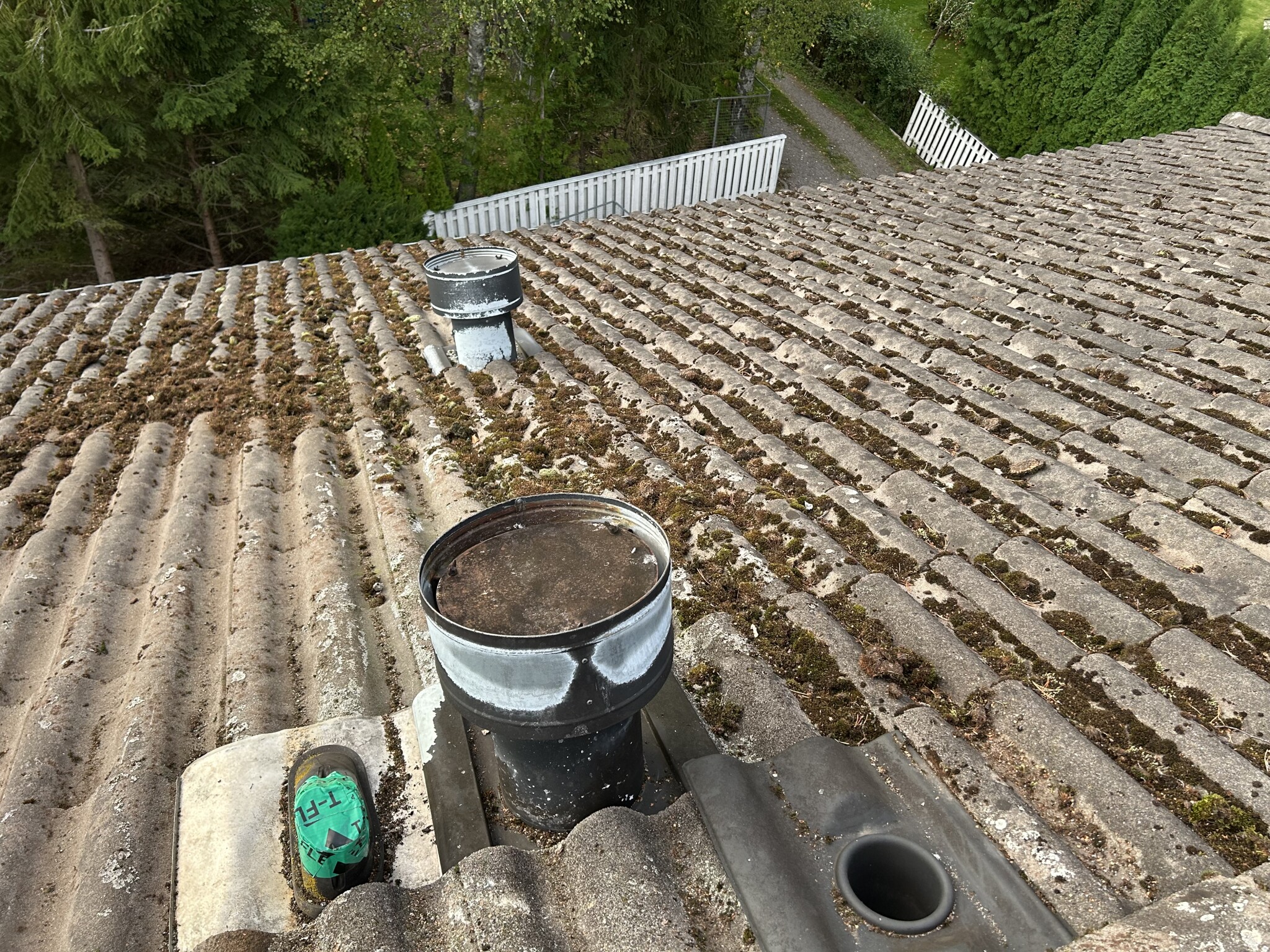 Nelson Gardens skrapa är sjukt bra och tar 90% av mossan snabbt. Har säkert 5-6 timmar kvar då vi tänker vara noggranna innan jag sprayar hela alltet med bensaltensid för att döda all kvarvarande mossa. Vill undvika att det rasar ner döda mossklumpar i ett år sen så kör för hand med morakniv och borste för att få riktigt rent. Tippar på att det här taket ev. aldrig gjorts rent. Två säckar mossa så långt men blir nog två till. Icket en sprucken eller dålig panna faktiskt även fast taket är 40 år nu.