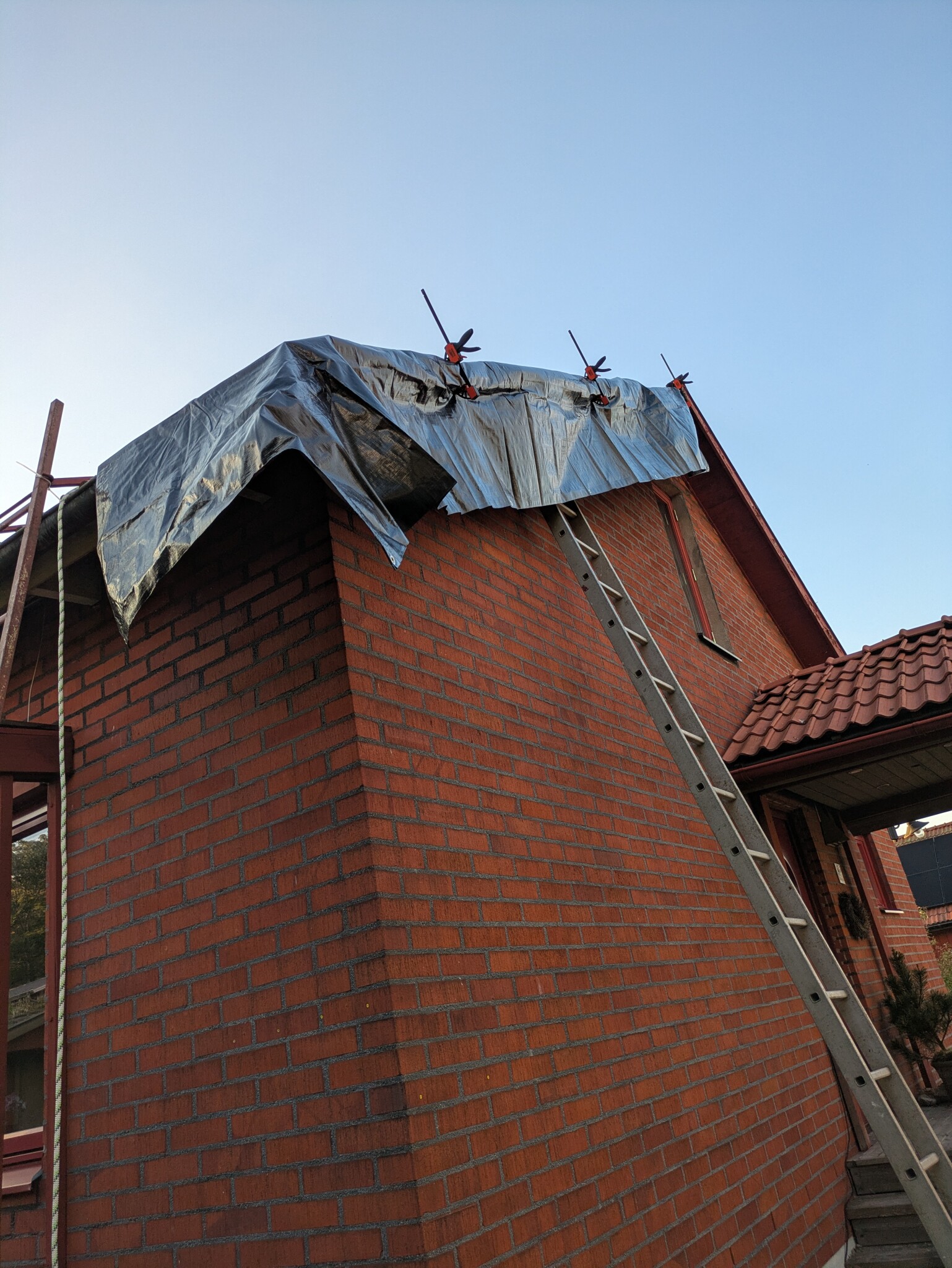 Plockade ner stor antenn och parabol också och gjorde Åsa-Nisse-tätning med åldersbeständig tejp för diffusionsspärr. Lär hålla över vintern om jag mot förmodan inte lagar papp och byter till pannor snart.