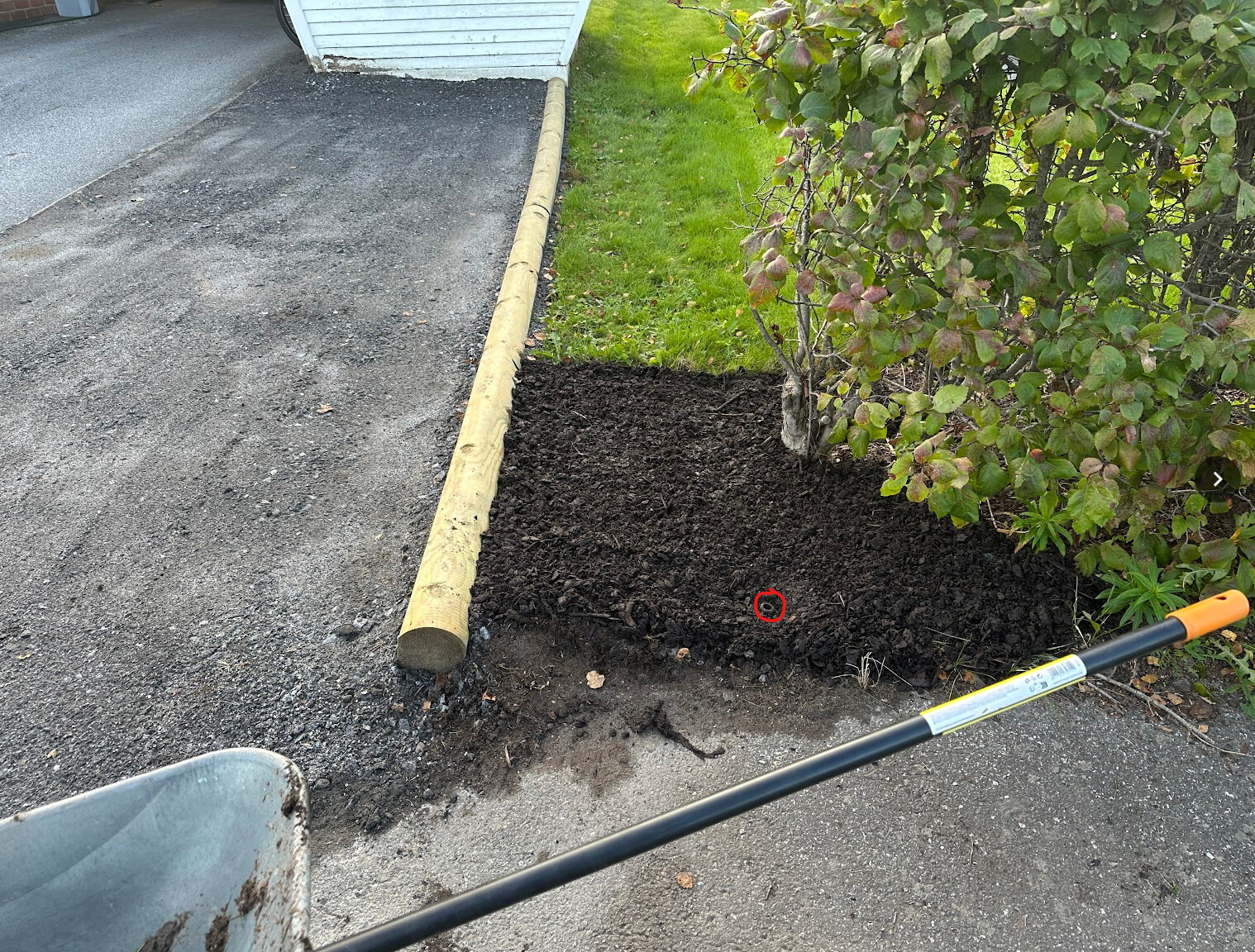 Skulle bara kratta ut lite ny täckbark vid häcken, men jag tycks ha hittat tomtmarkören vi inte sett tidigare. Vi har trott att gränsen går precis vid det lilla förrådet och att taket till och med är över, men så verkar ju inte vara fallet då