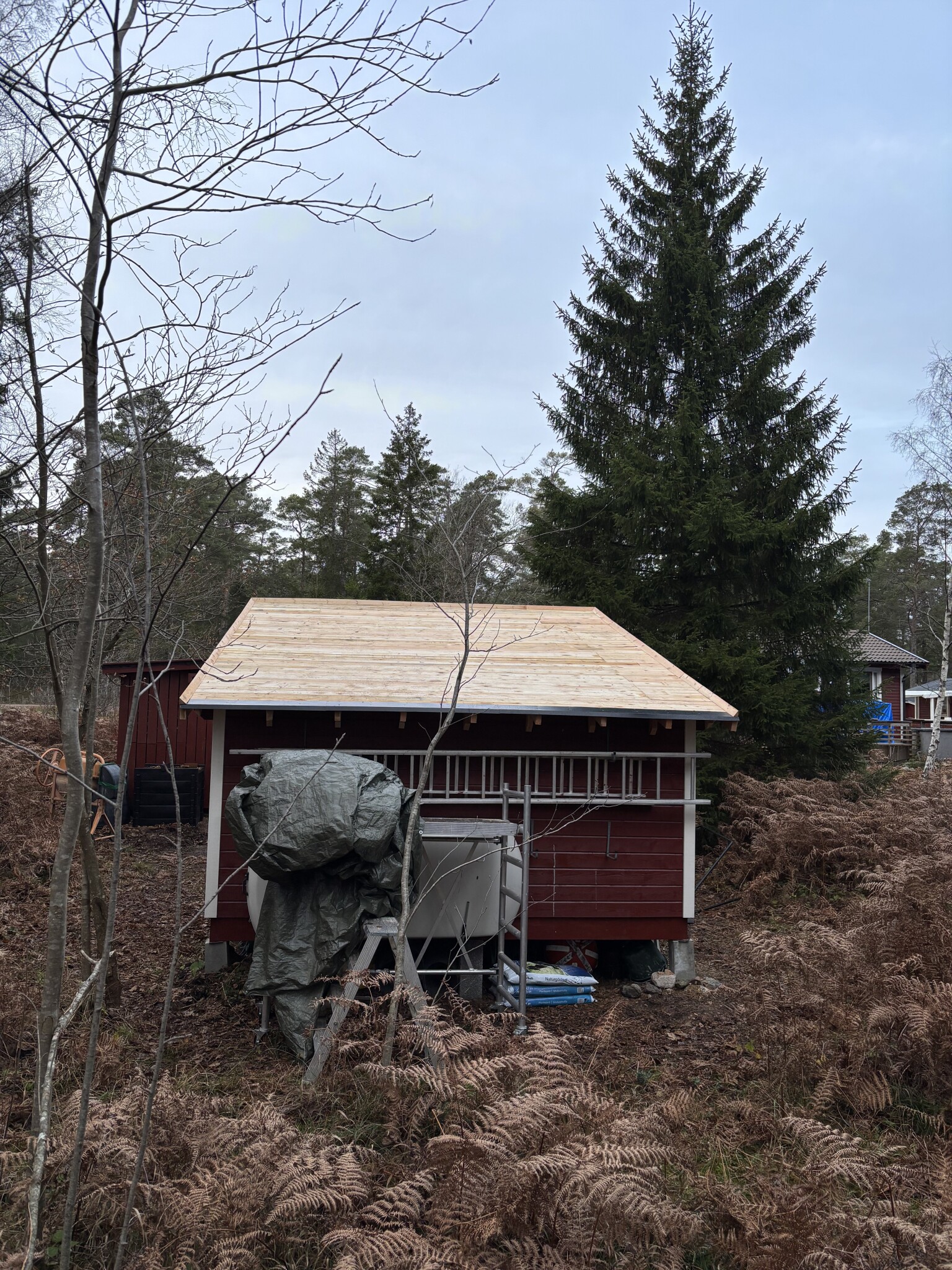 Rivit ett gammalt plåttak i dåligt skick och ersatt det med råspont under helgens ljusa timmar. Passade på att förlänga takfoten i framkant och bakkant. Takpappen får vänta tills nästa helg så en presenning ligger nu över som provisorium. Inte en optimal tid under året för detta och en utmaning att krypa runt och riva frostigt plåttak när närmsta människa är en kilometer bort.