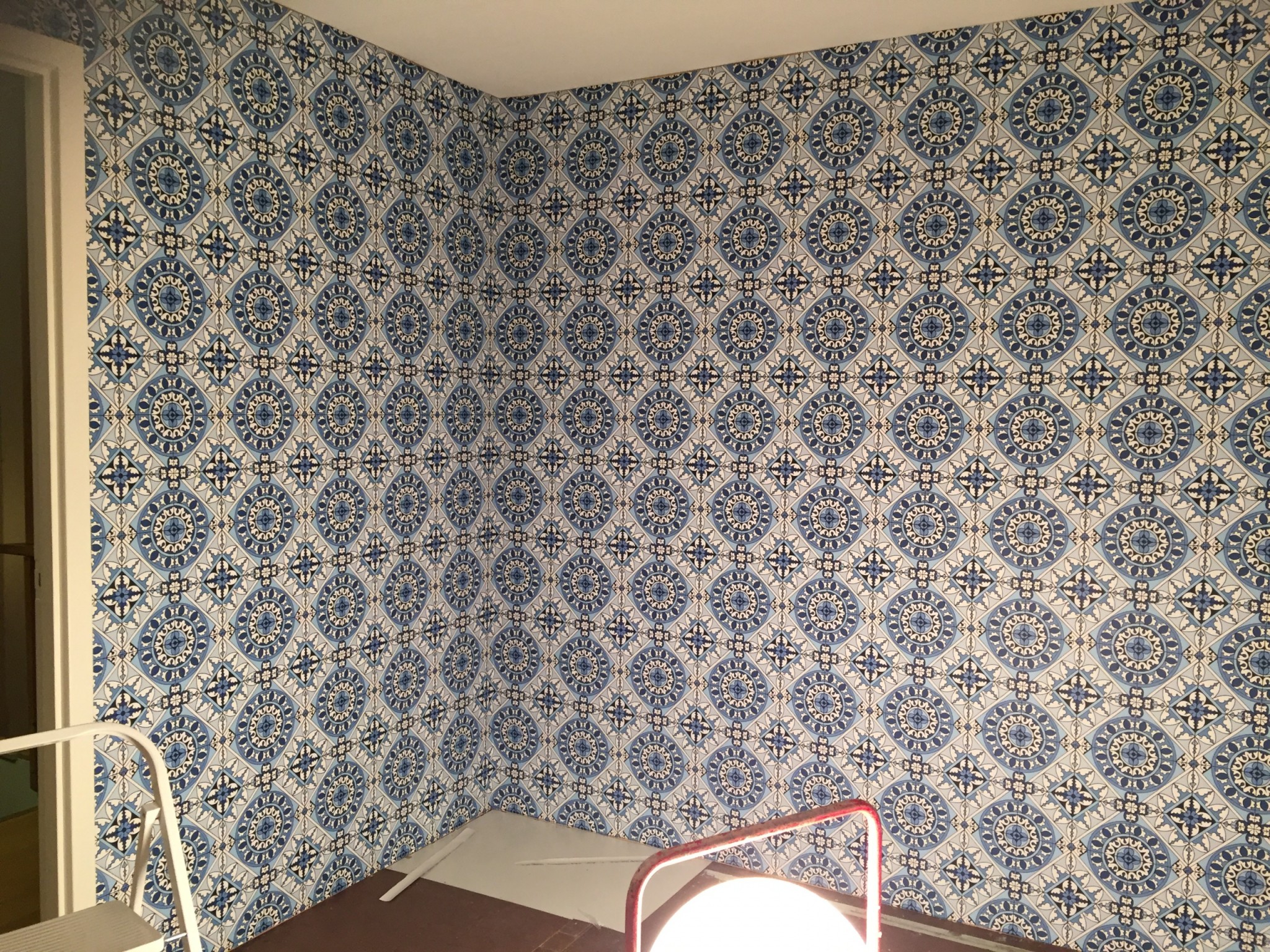 Sandat uppfart och infartsväg som är blank som en skridskobana. Satt golvlister i rum nummer ett, nu är det klart bortsett från att vi väntar på en leverans nya eluttag. Målat sista varvet på ena sidan av dörr nummer två. Börjat tapetsera rum nummer två, fondväggen (som är mycket snyggare i verkligheten) är klar: