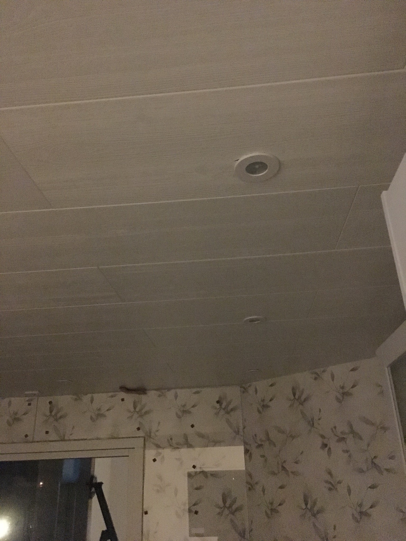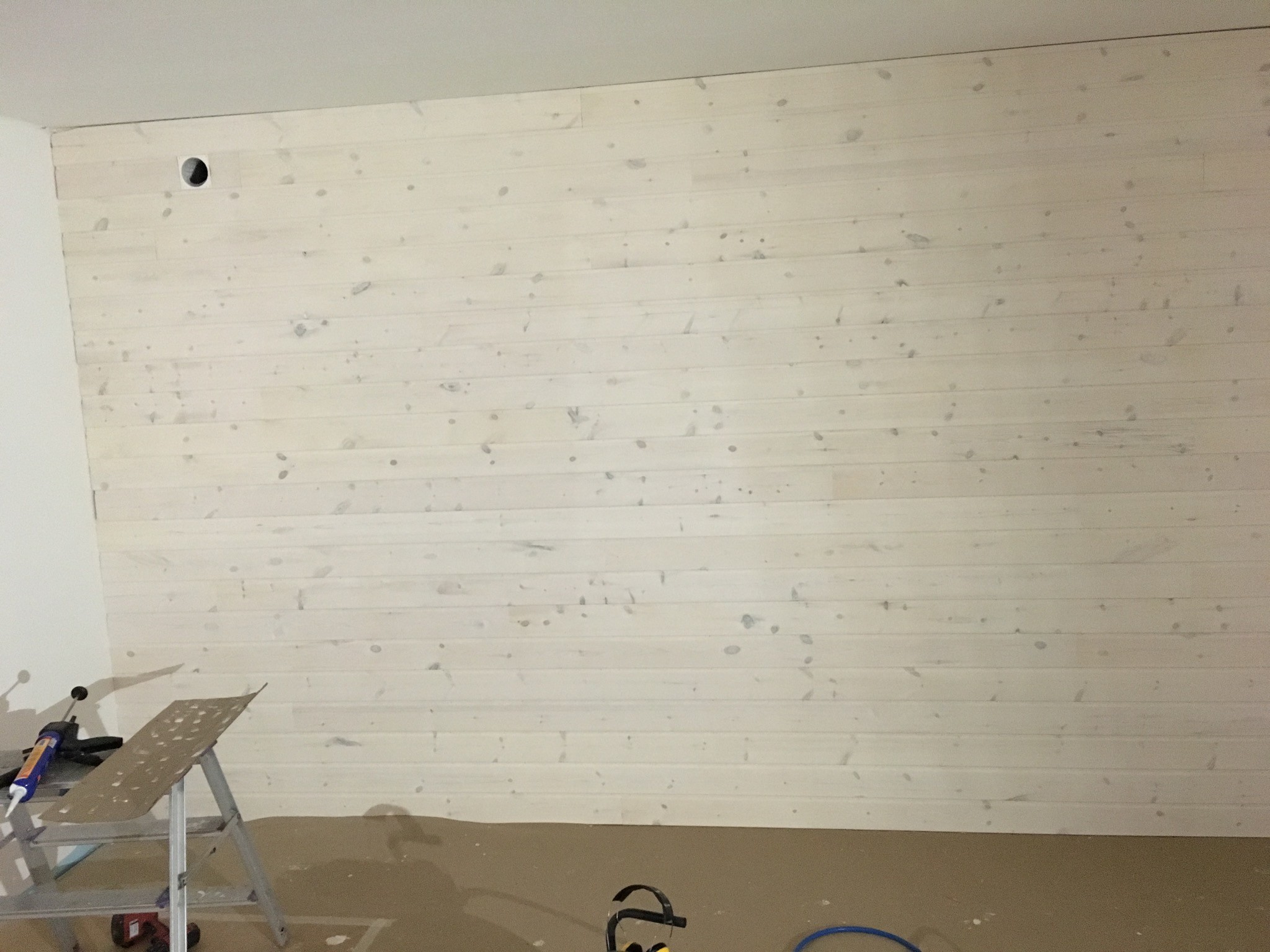 Panelat en vägg, foder börjar sättas , elektriker har satt lite spottar