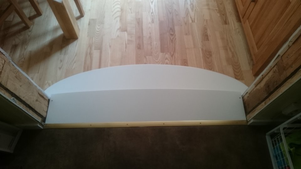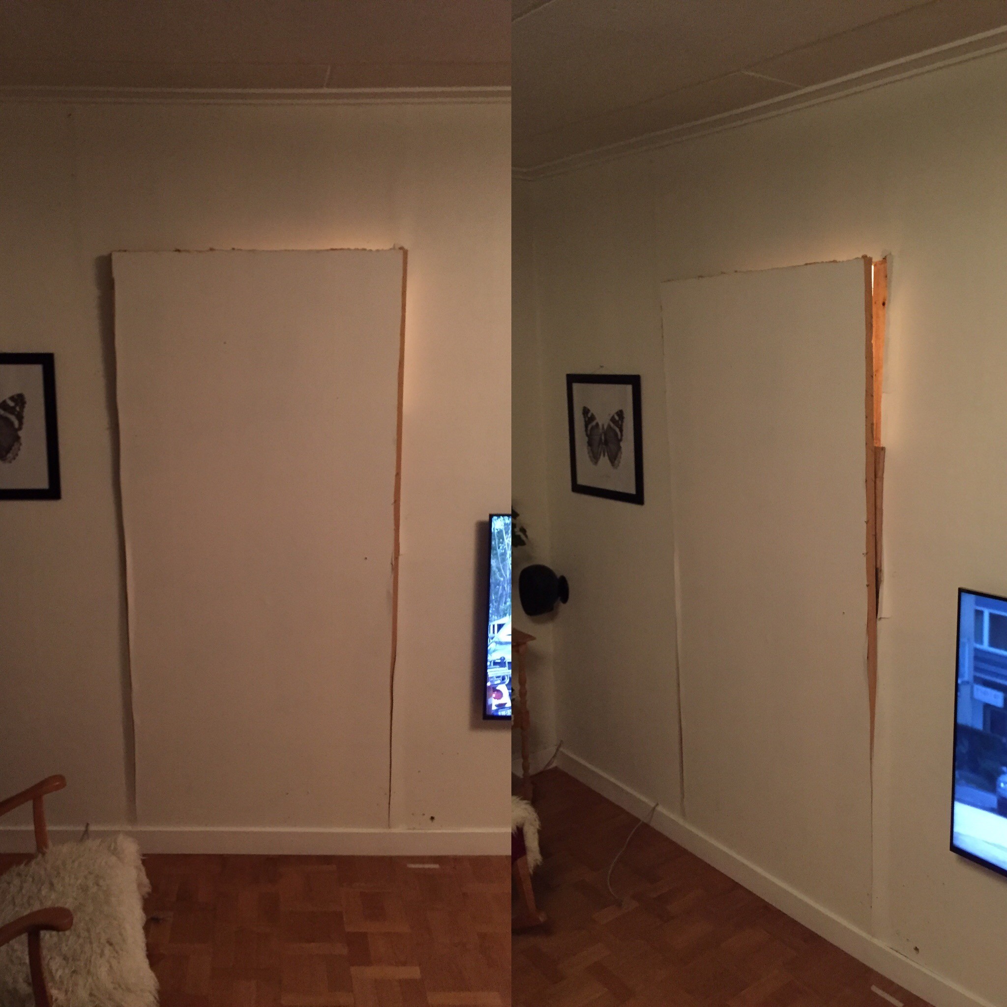 Sedan tog jag och smygstartade projekt dörr mellan vardagsrum och matrum. Vi har sett på ritningar att det varit en dörr där tidigare och hålet var igensatt med några brädor och en tretexskiva. Så det var bara några skär med mattkniven och lite milt våld med kofoten för att återöppna