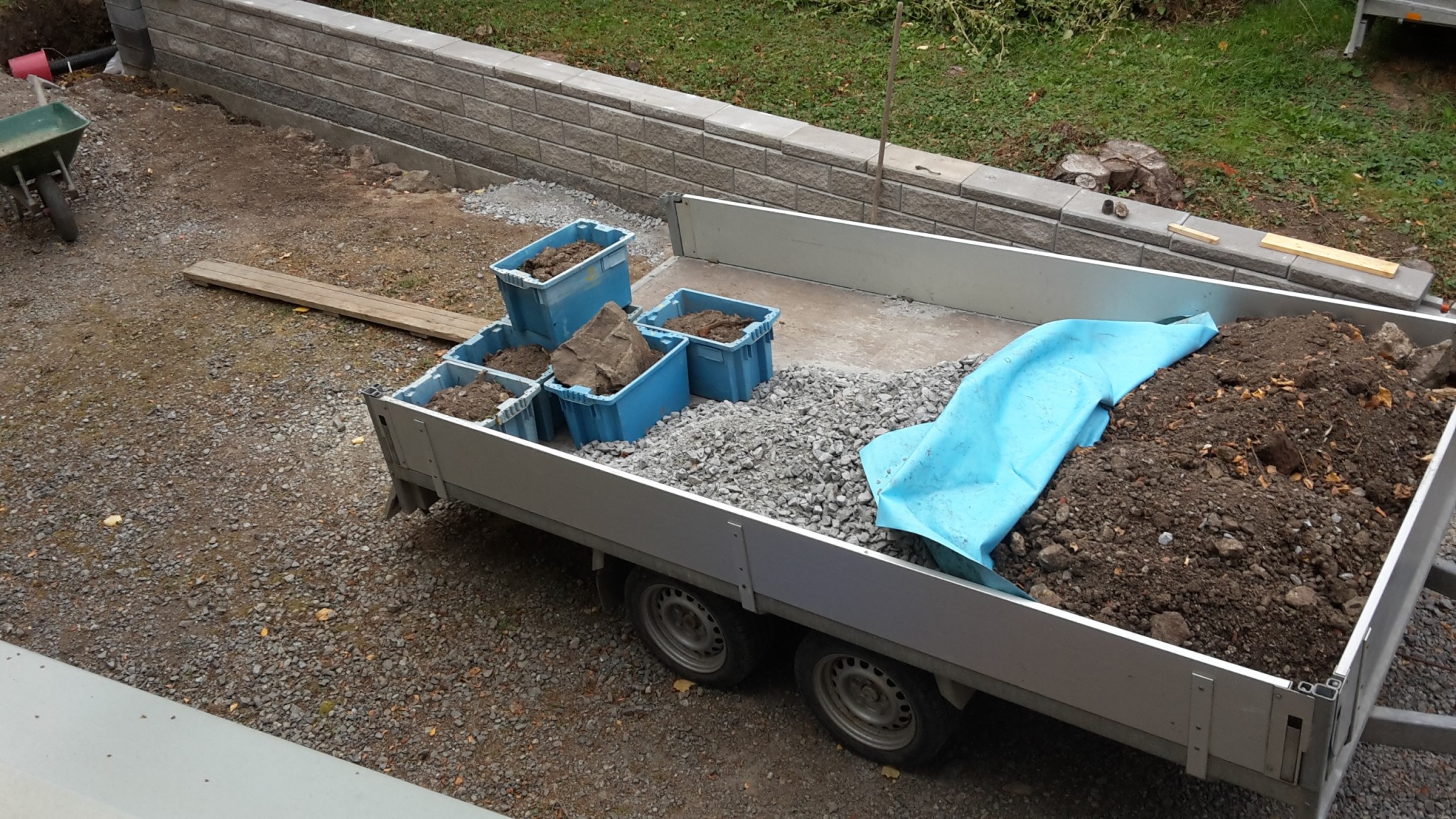Om någon undrar varför man ska ha ett för stort släp så beror det på att det behövs. Här ligger det 700kg bergkross mitt på samtidigt som jag lastar på massorna jag gräver bort