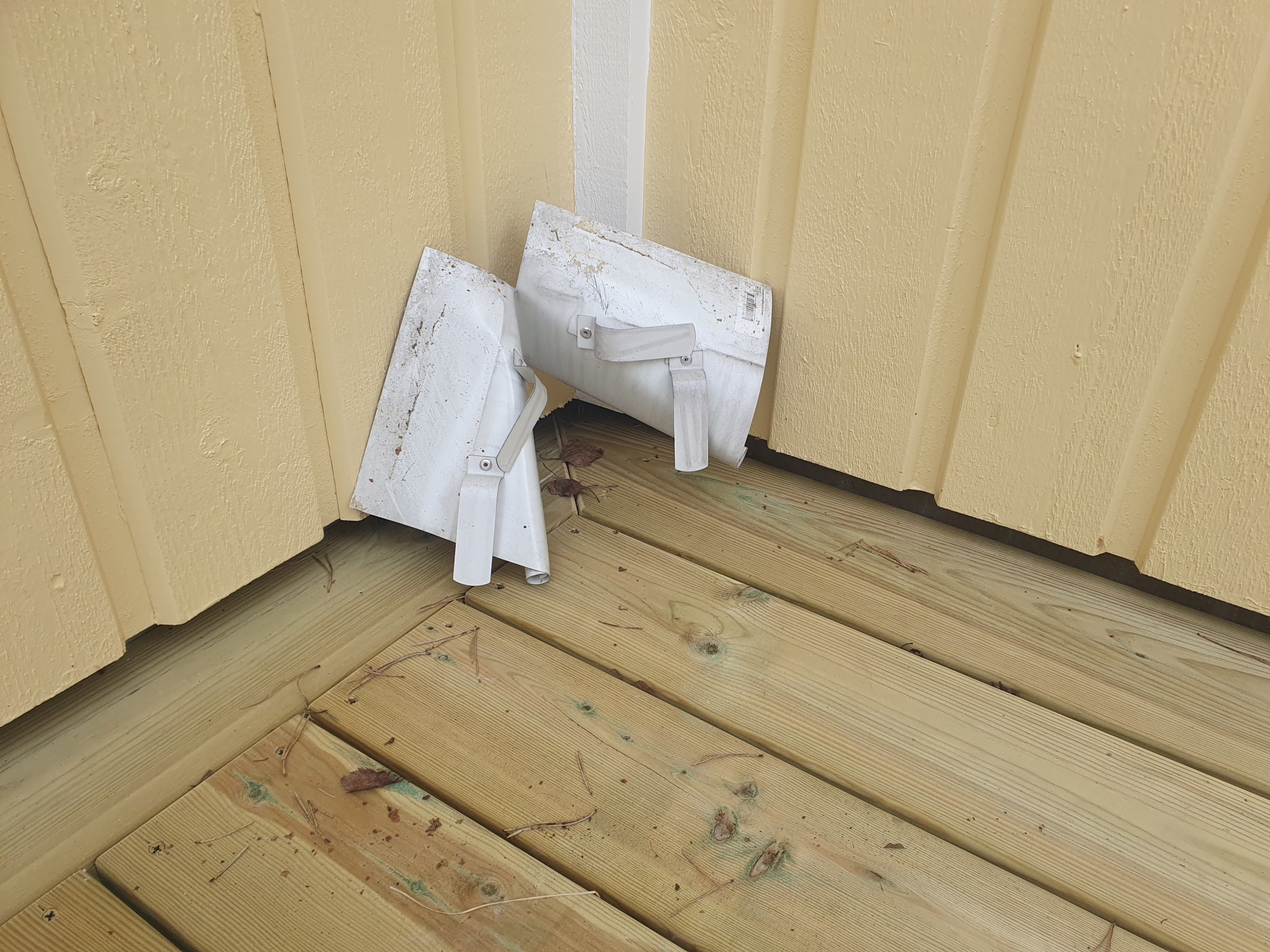 Nedan bilder visar dels en plåtdel som ramlat ner från rännan, dels den troliga orsaken i vad som finns kvar (stuprörsränna fylld med skräp).