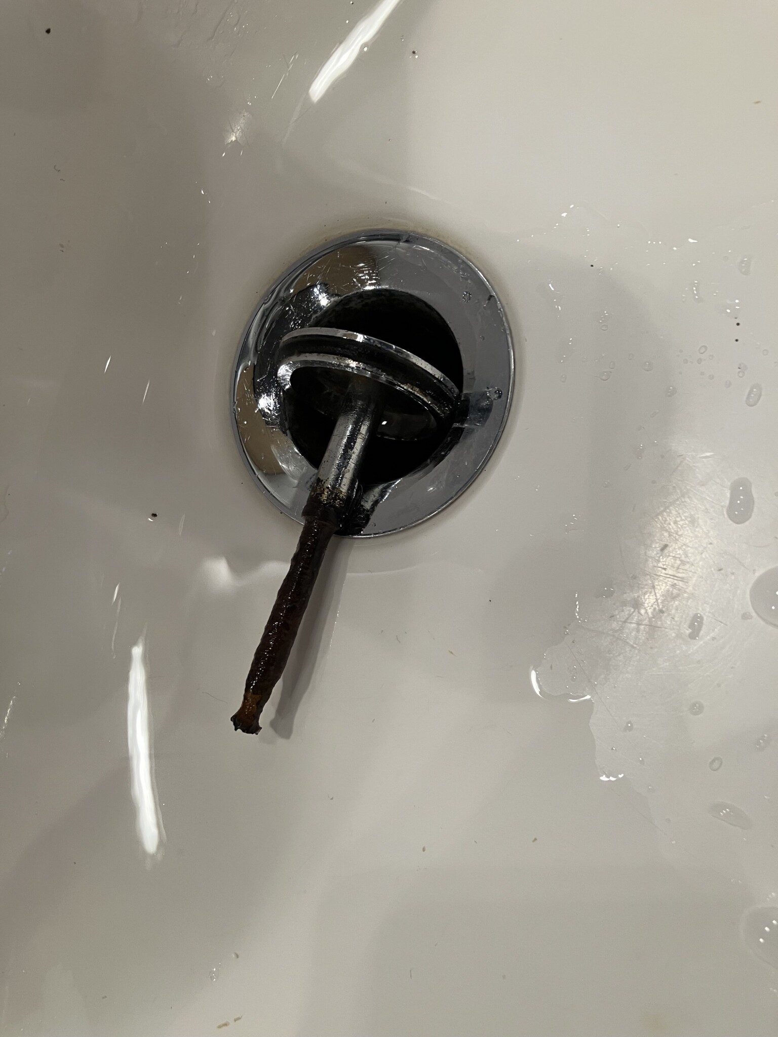 Plastskruven som sitter i ”bottenpluggen” i mitt tvättställ (i badrummet, tror möbeln är från IKEA) gick av för något år sedan. Jag hittade ingen reservdel så jag satte i en vanlig skruv i metall istället. Nu är den sönderrostad så dags att göra något bättre. Vad heter delen jag söker? Borde ju gå att få tag på tycker jag.