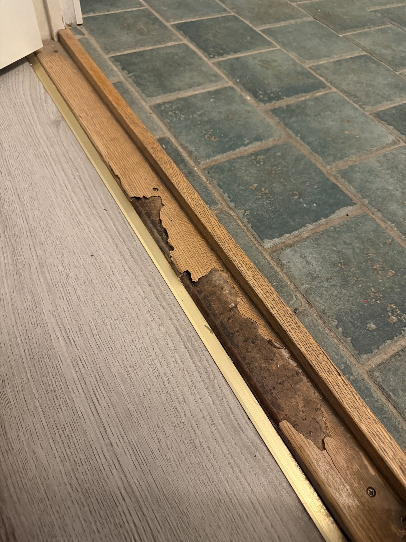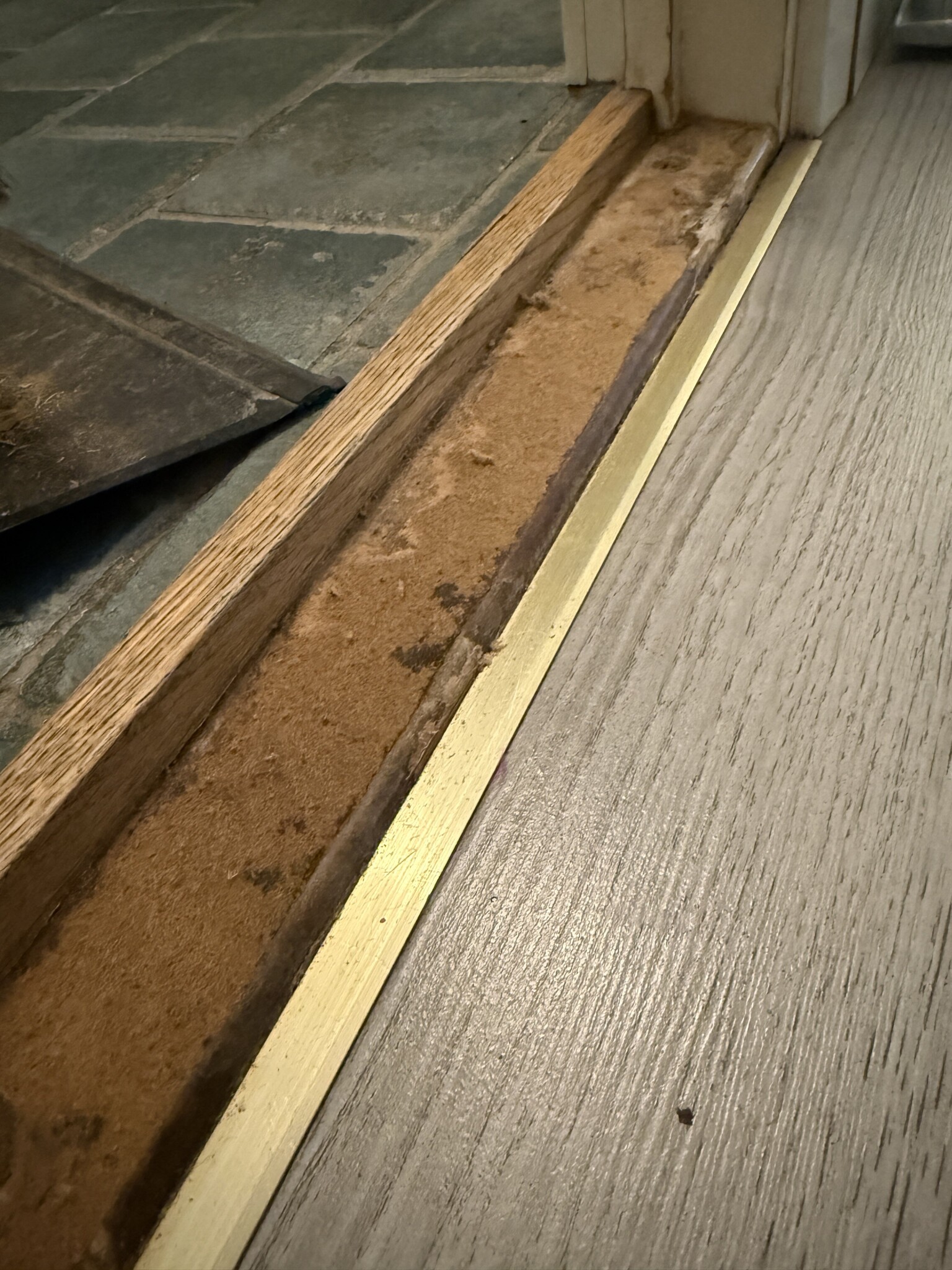 Detta är tröskeln mellan hall och toalett som från början såg ut som första bilden. Min första tanke var att ta loss och byta den, men den verkar långt ifrån lätt att få loss. Då tänkte jag att den kanske går att slipa, men det blir bara värre (se bild 2). Så nu är jag tillbaka på första tanken. Den måste bytas. Någon som kan tipsa hur jag får loss den utan att ha sönder något annat?
