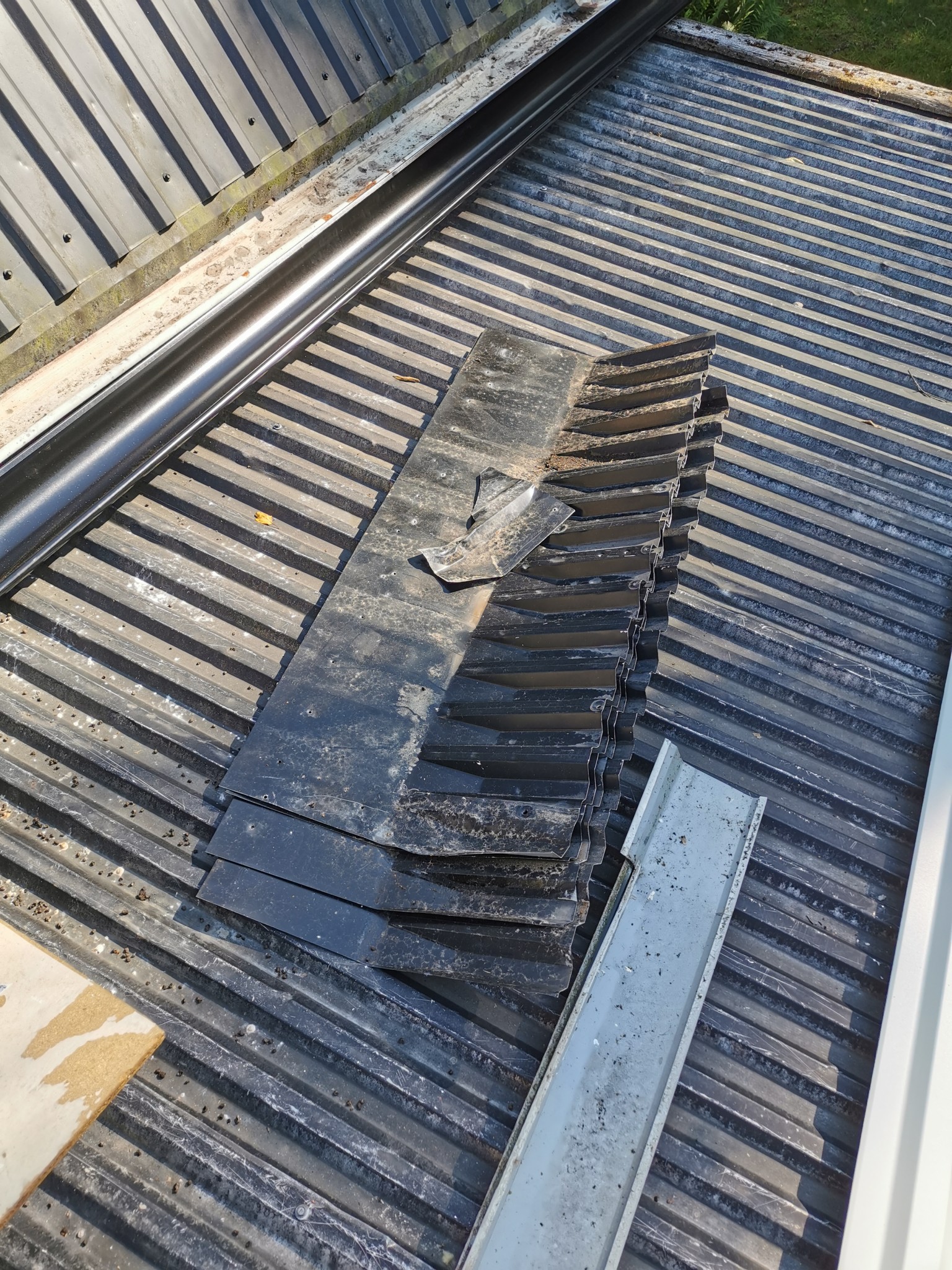 Har lagat en del av taket pga vattenläcka. Bytt plåtarna. Men nu är det ju så att de gamla plåtarna som satt mellan det stora taket och det taket vi lagat inte passar med den nya plåten. Undrar därför vad den delen av plåt heter som jag behöver. Skickar med bild på de gamla plåtarna och på stället det behövs nya. Enligt min morfar så är de gamla plåtarna antingen hemmabygge eller specialbeställda. Jag tänker mig en vinklad plåt och tätningslist?