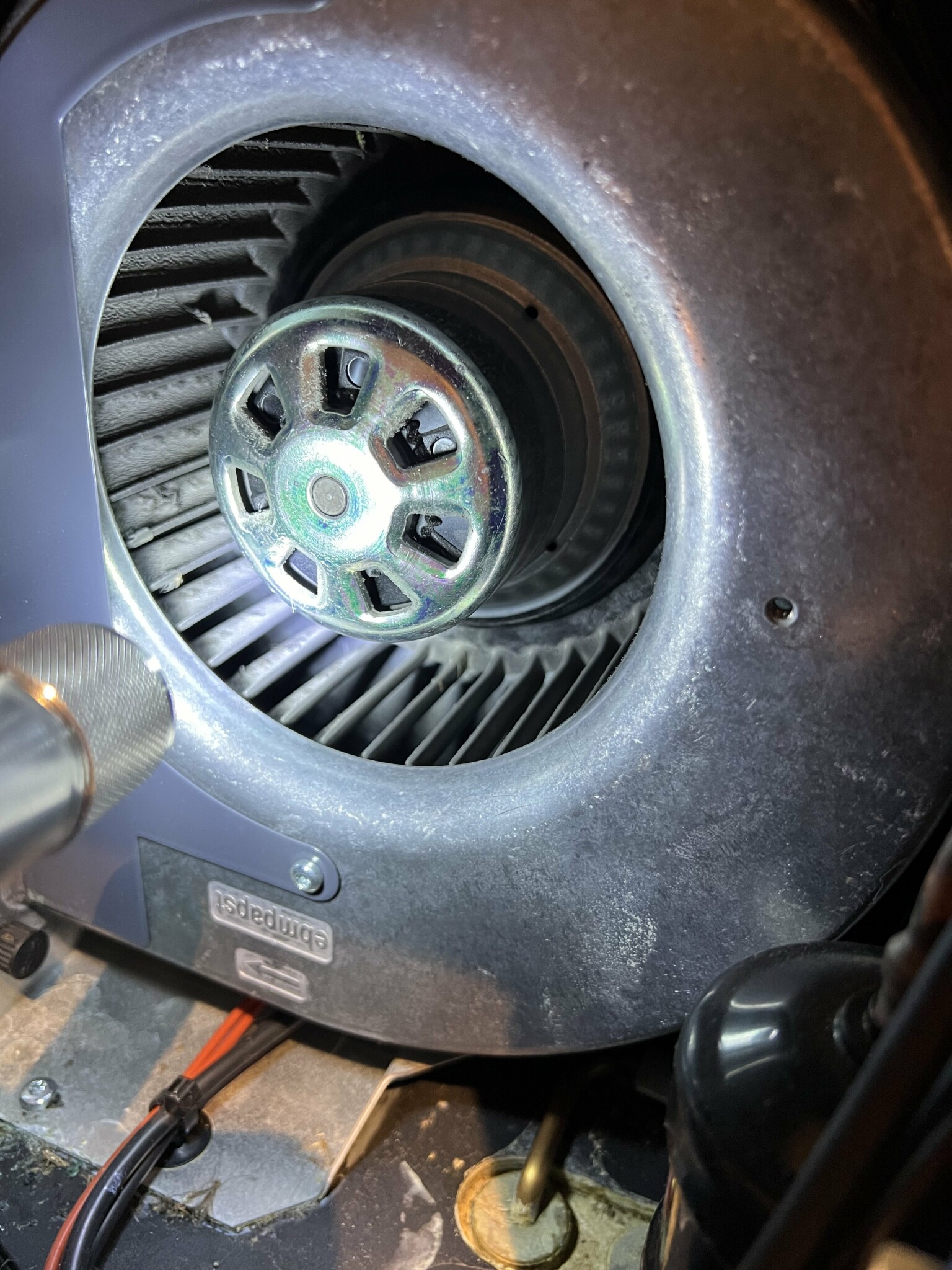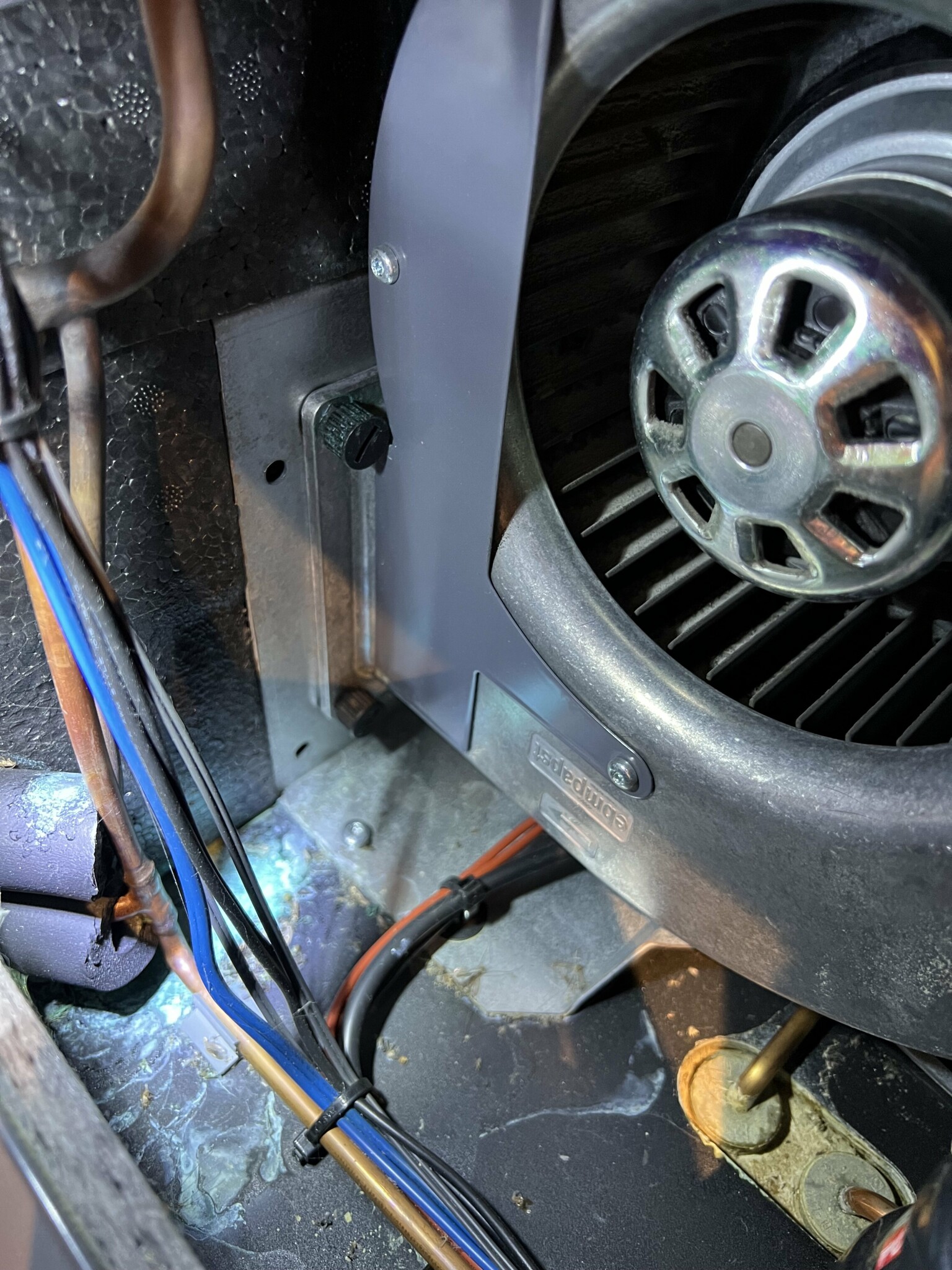 Har nu lyckats öppna frontwn och kikat på fläkten. Hittae inget vatten och inget löst vad jag kan se. Ljudet kommer numera inte ofta och oklart när. Fläkten kan vara igång utan att något hörs. Har nu fronten avskruvad för att kunna lyssna närmare nästa gång det sker. Klurigt dock då vi bara är här på landet 2-3 dagar i taget.