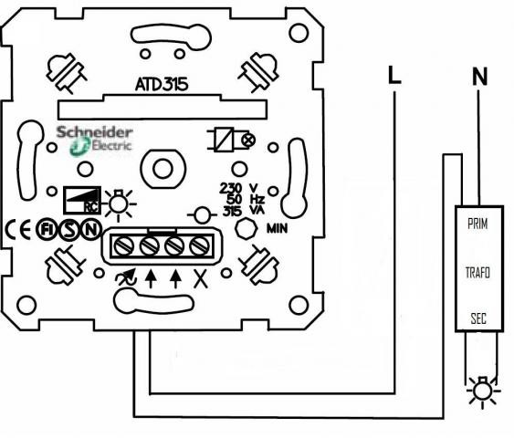 Okej, har satt en Trend Transistordim inf IP20 315W P-vit på primärsidan på en trafo från beslag design. Transformator Elektra PT105, (Leading Edge & Trailing Edge Dimming), Kopplat enligt bif bild där LOAD är primärsida trafo och L är inte över brytare. Inget lyser. Kopplade förbi dimmer och inget lyser. Trafon driver 4 st 12V 20W. Trafon verkar ha pajjat!? Vad kan vara fel?