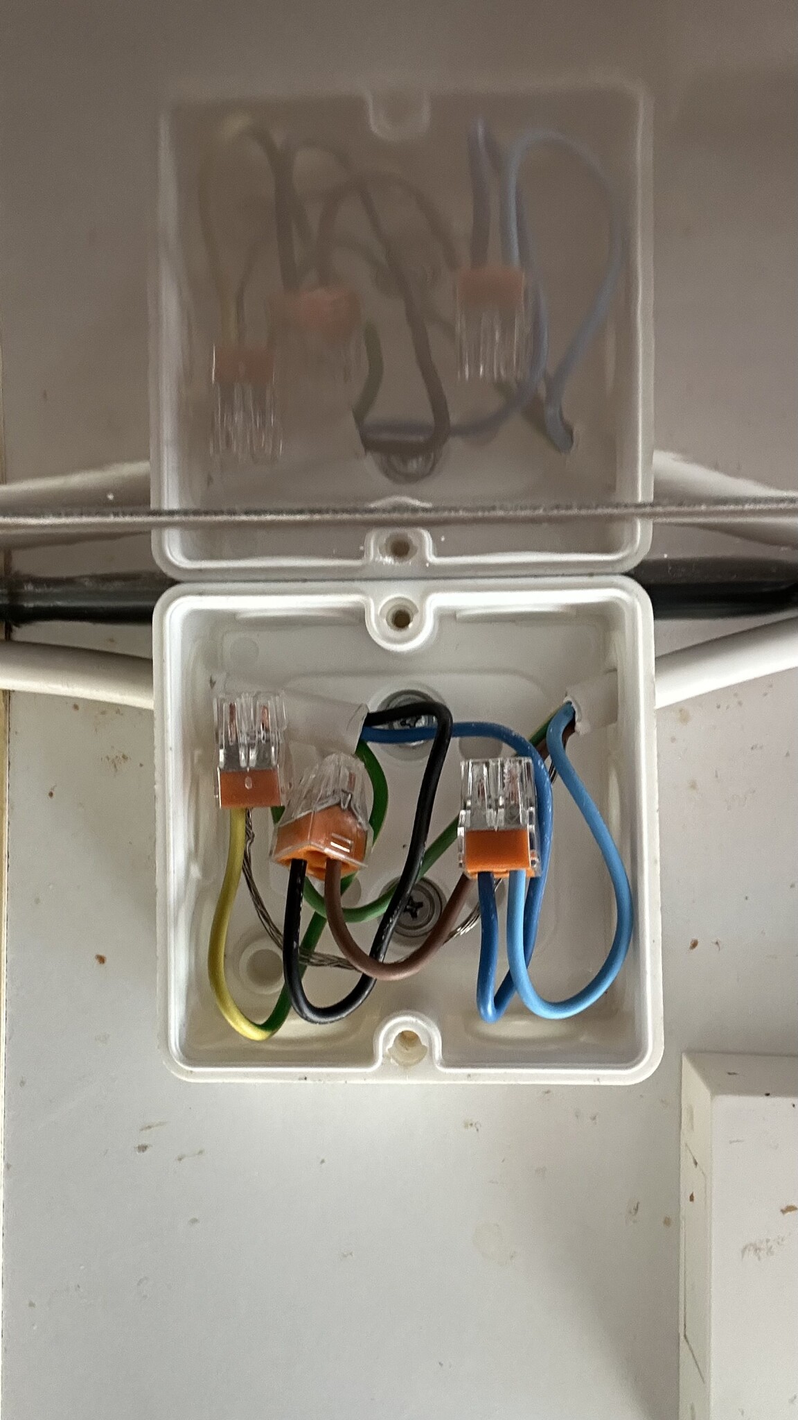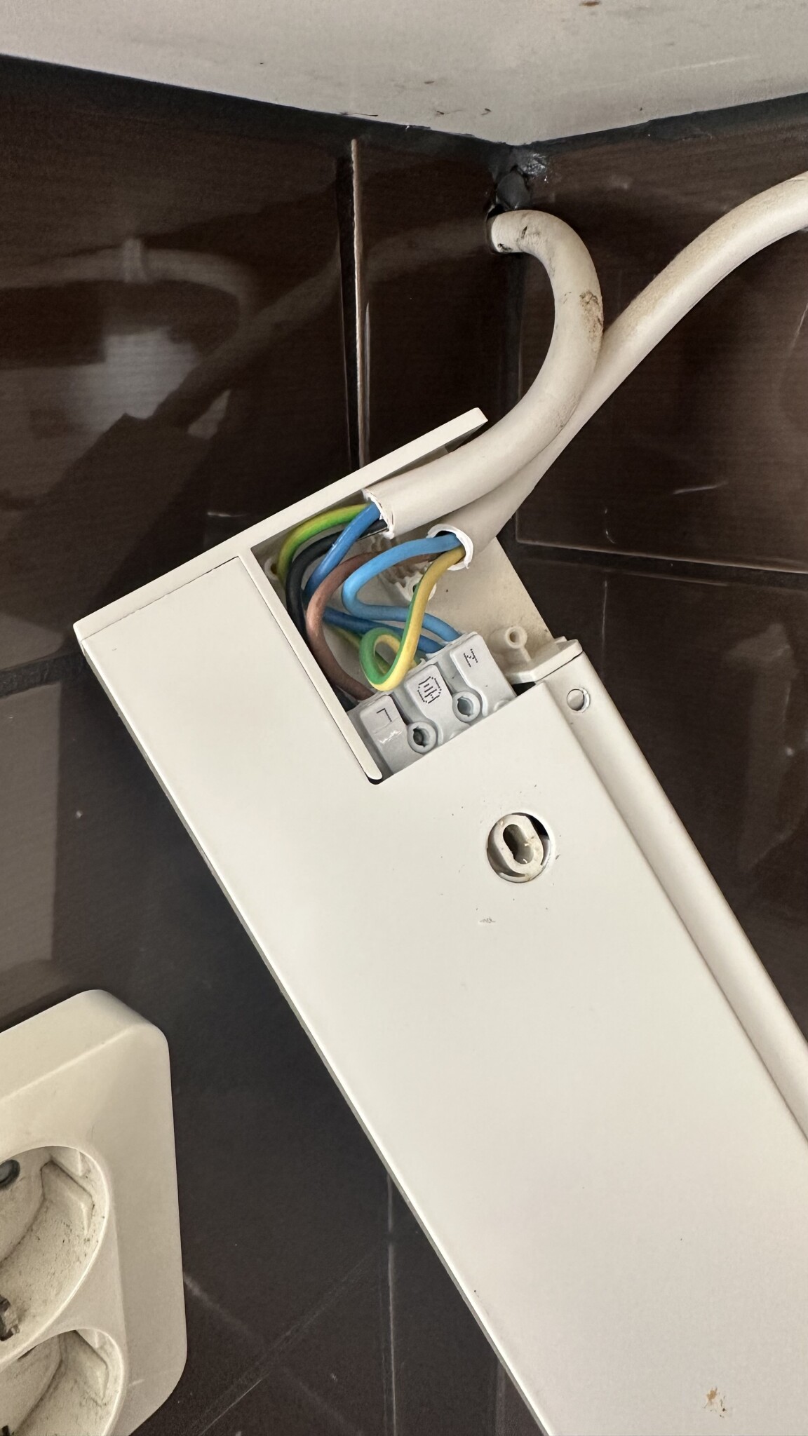 LED-lampan som sitter ovanför köksbänken har i princip slutat funka och jag började skruva isär lite för att se hur det var kopplat och vad jag kan göra själv och vad jag behöver en elektriker till. Ut ur väggen kommer det två strömkablar (en vid kaffemaskinen och en vid spisen), men den vid spisen går bara in i en liten låda som sen går vidare till belysningen?