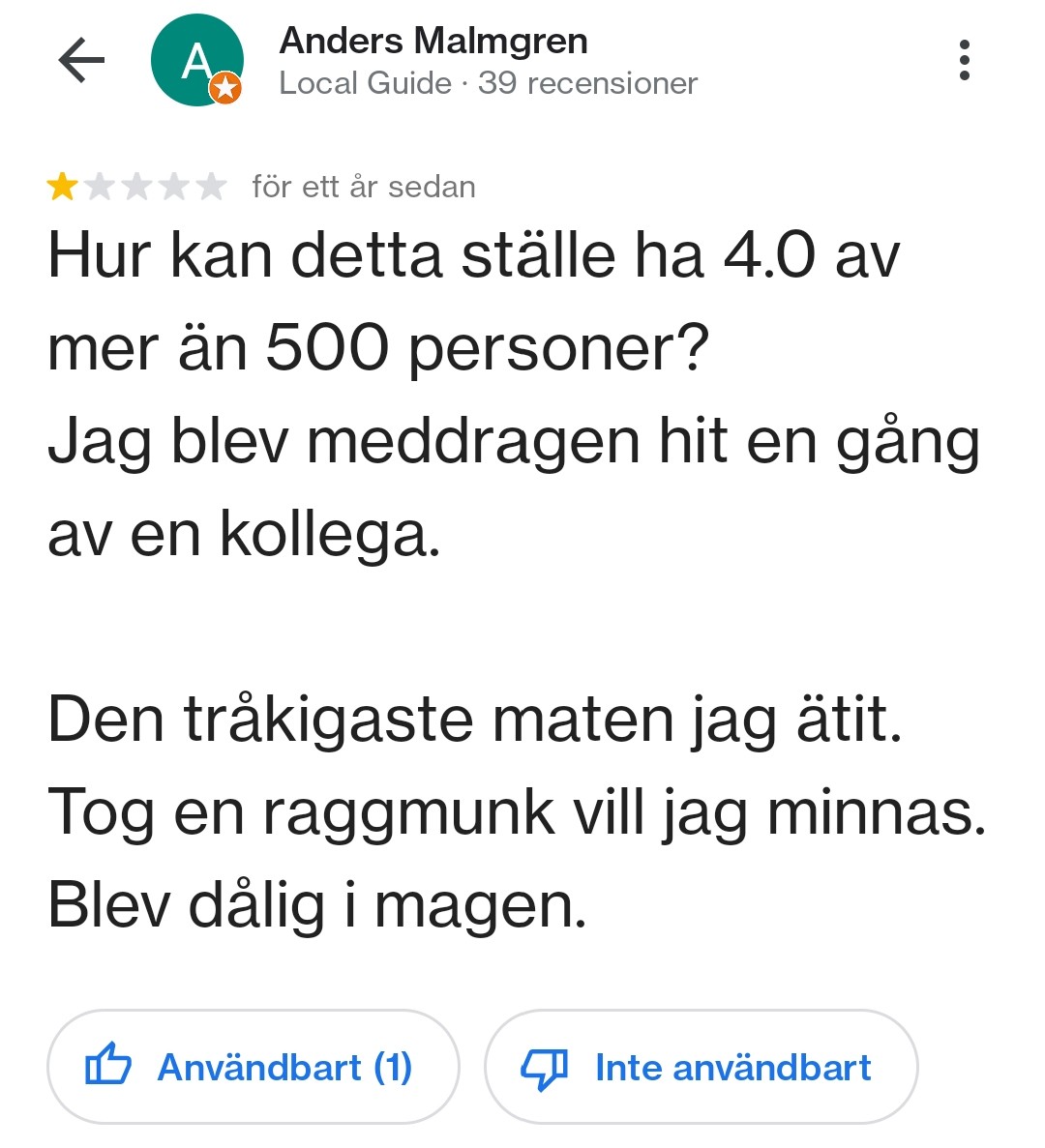 I länder med mat på gatan-kultur fungerar jag också lite annorlunda. Men annars brukar jag köra white guide, Michelin eller kombo av Google maps / tripadvisor. Bara gå på google maps är vanskligtL Lilllen skrev:Jo, självklart får man bedöma även själv om det verkar vara en restaurang man själv vill äta på, För mig behöver dock inte upplevelsen vara att det är den bästa maten jag ätit, utan upplevelsen kan vara något helt annat.