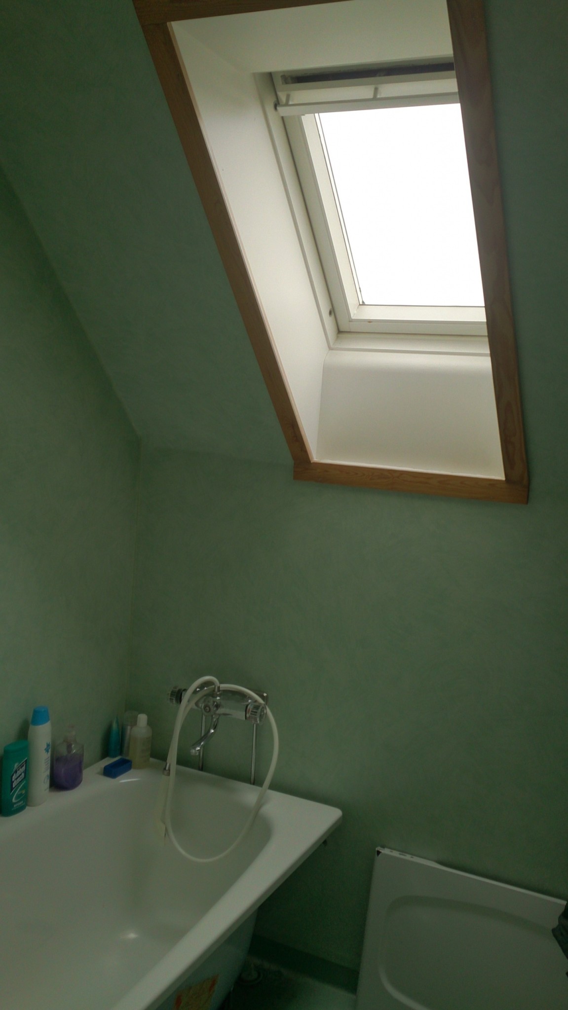 bilderna nedan är på mitt badrum. som ni ser ingen möjlighet att stå upp och duscha utan att behöva torka golvet efteråt. det är snedtak och kring fönstret sitter trälister (varför trä)