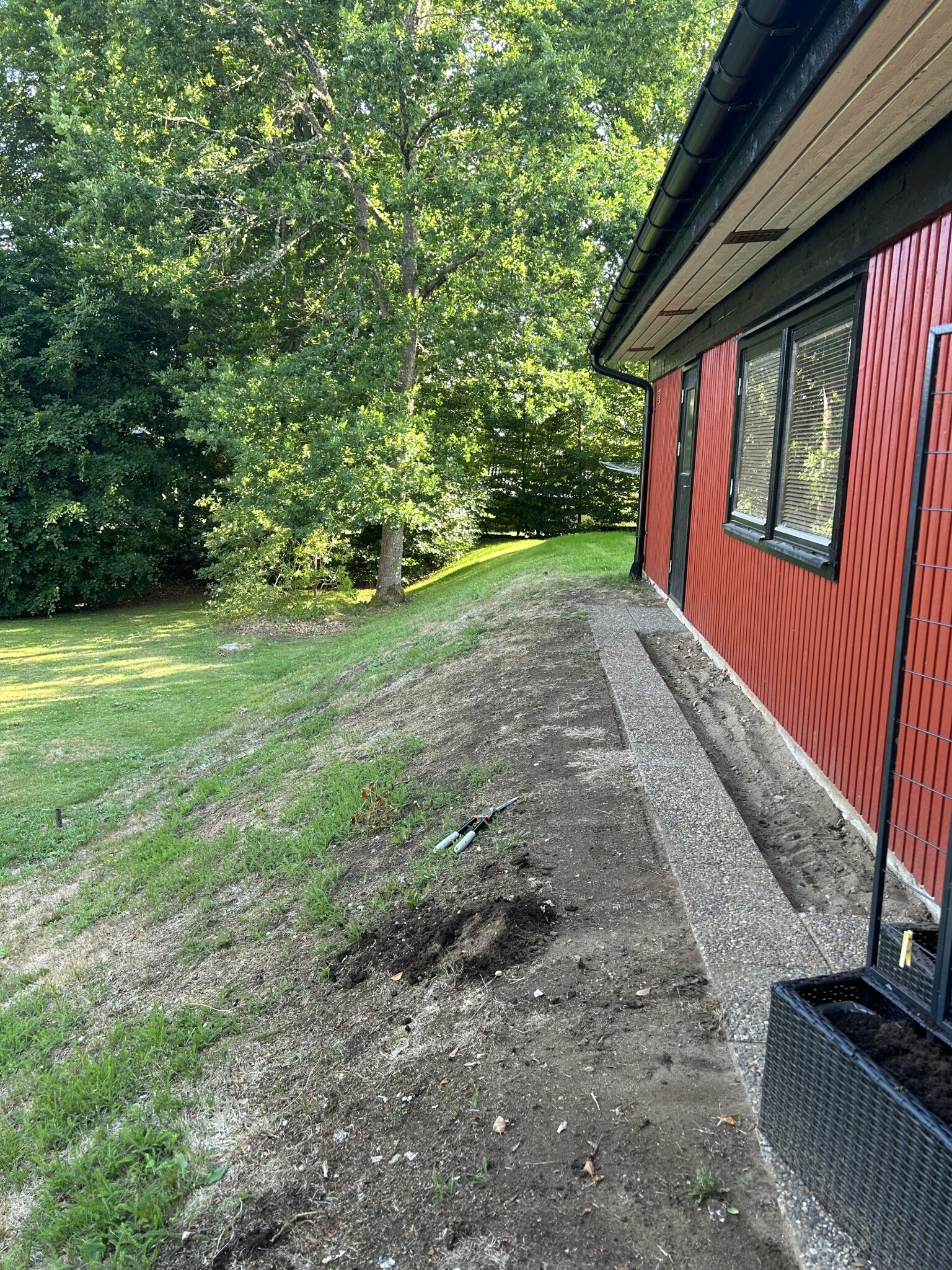 Det är ju mycket lutning från huset som ni ser på bilden men det känns som att jag riskerar att skapa en liten vallgrav intill grunden.