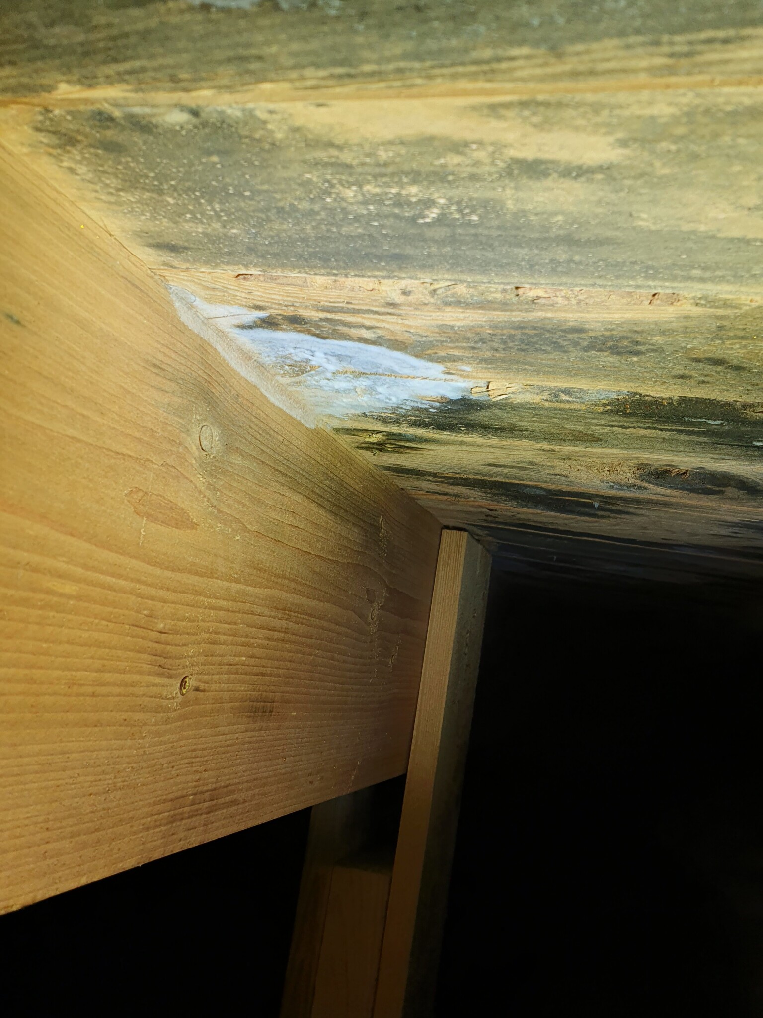 Hej! Jag flyttade in i 70-talsvilla för 2 månader sedan. Idag var jag upp på vinden och hittade vad jag tror är vitmögel ovanför badrummet/bastun. (Se bild)