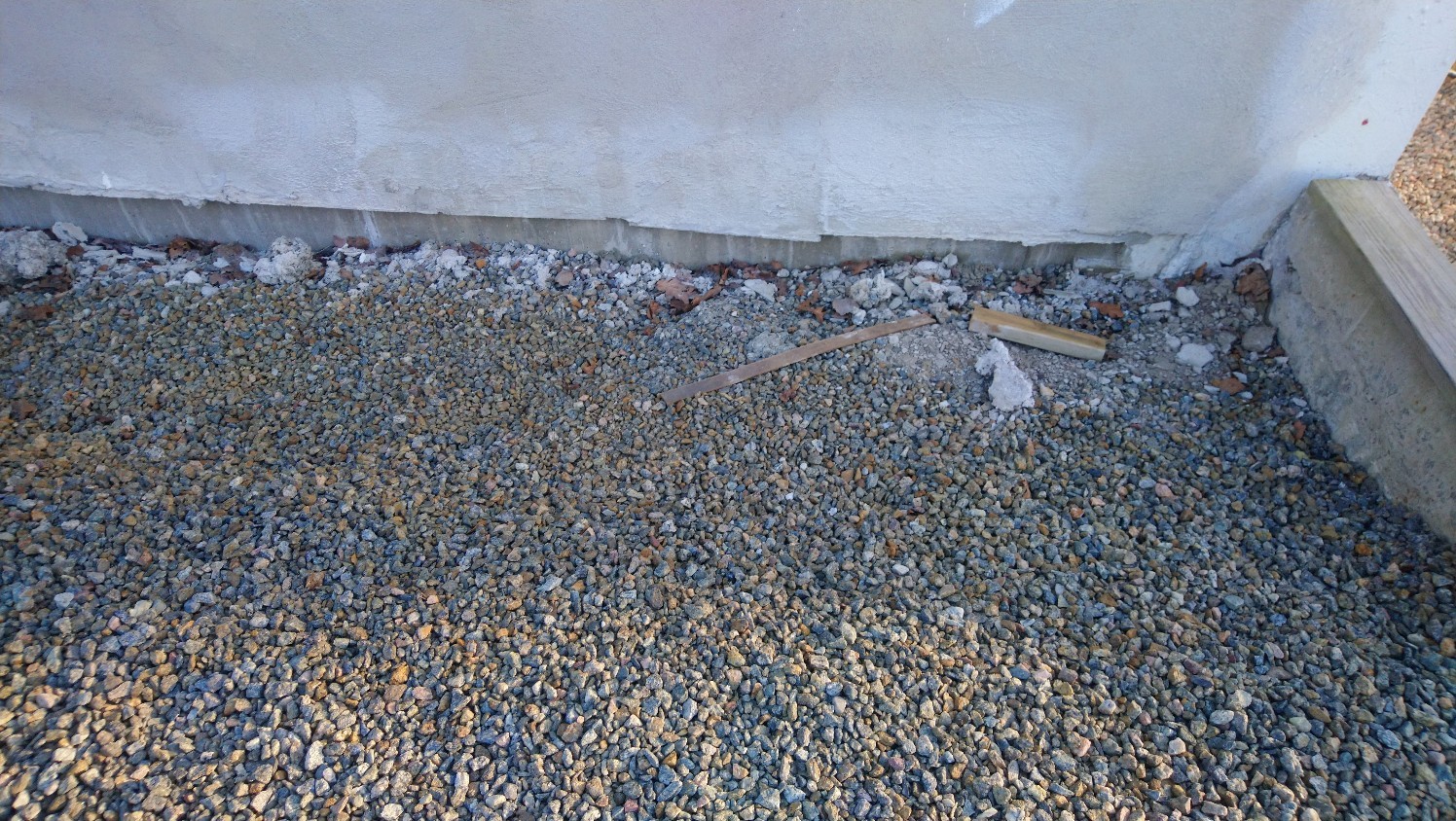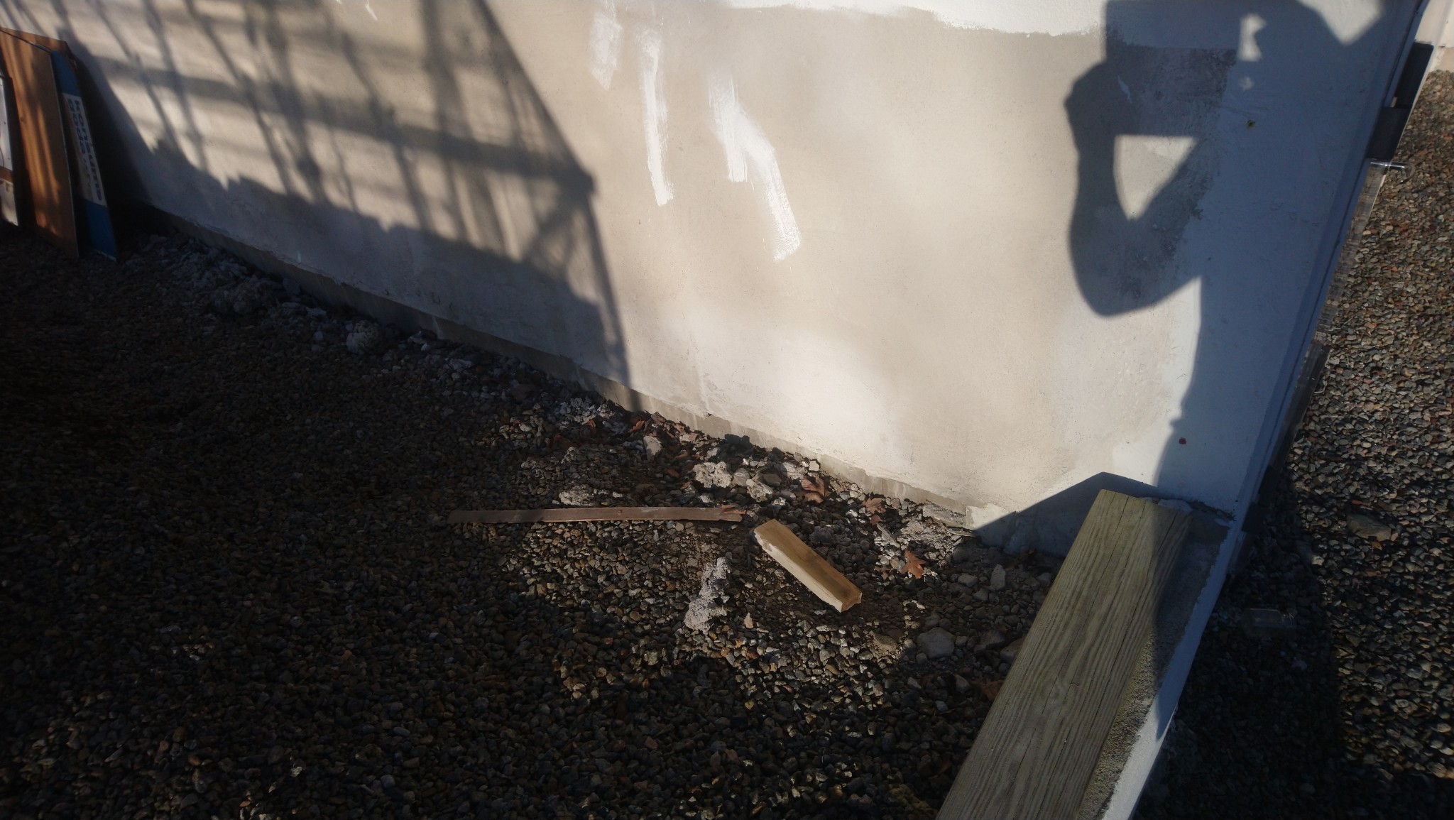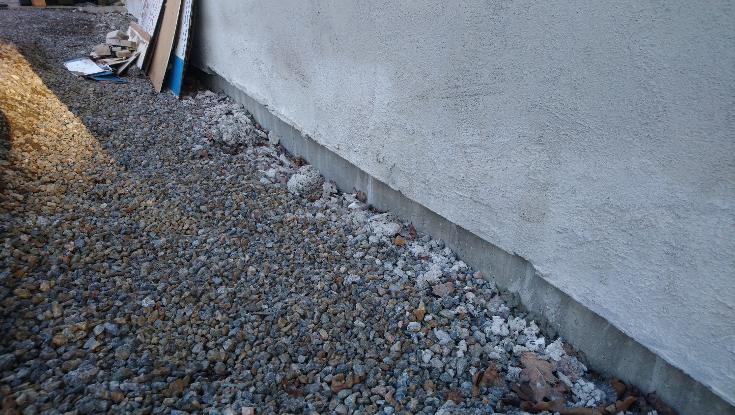 I höstas fick jag klar den här mursnutten, putsad och klar. Om ni ser på bilderna så kommer den vara ca 20 cm under grus på sina ställen. Det kommer nog aldrig stå vatten mot muren, men gruset kommer ju bli fuktigt då det regnar.