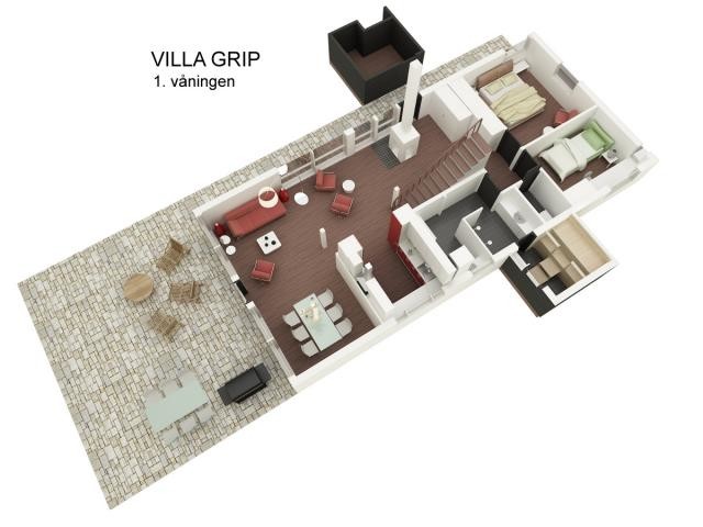 Följdfrågor är bra. Vårt sovrum blir på övervåningen/loftet. Så lilla rummet nere blir extra rum. Sen har vi en befintlig lada på tomten där vi tänkte inreda ett gästrum. Det där med entren har vi diskuterat en del och jag är nog också inne lite på att vi måste ha någon avskärmning där. Förvaringsytrymmen blir nog en del garderober på loftet och till höger när man kliver inanför dörren.