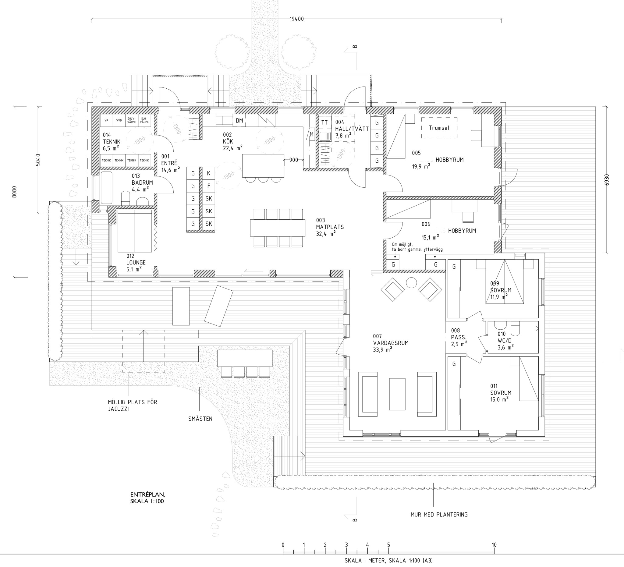 Teknikrummet och badrummet är både tillgänglighetsanpassade. Det syns lite svagt på ritningen att det är utritat en streckad ring som är 130 cm på flera ställen i köket, hallen, teknikrummet etc. för att visa att det får plats för en rullstol att vända. Arkitekterna sa att badrummet är så litet som det får vara för att fortfarande vara tillgänglighetsanpassat. Teknikrummet är större än badrummet.