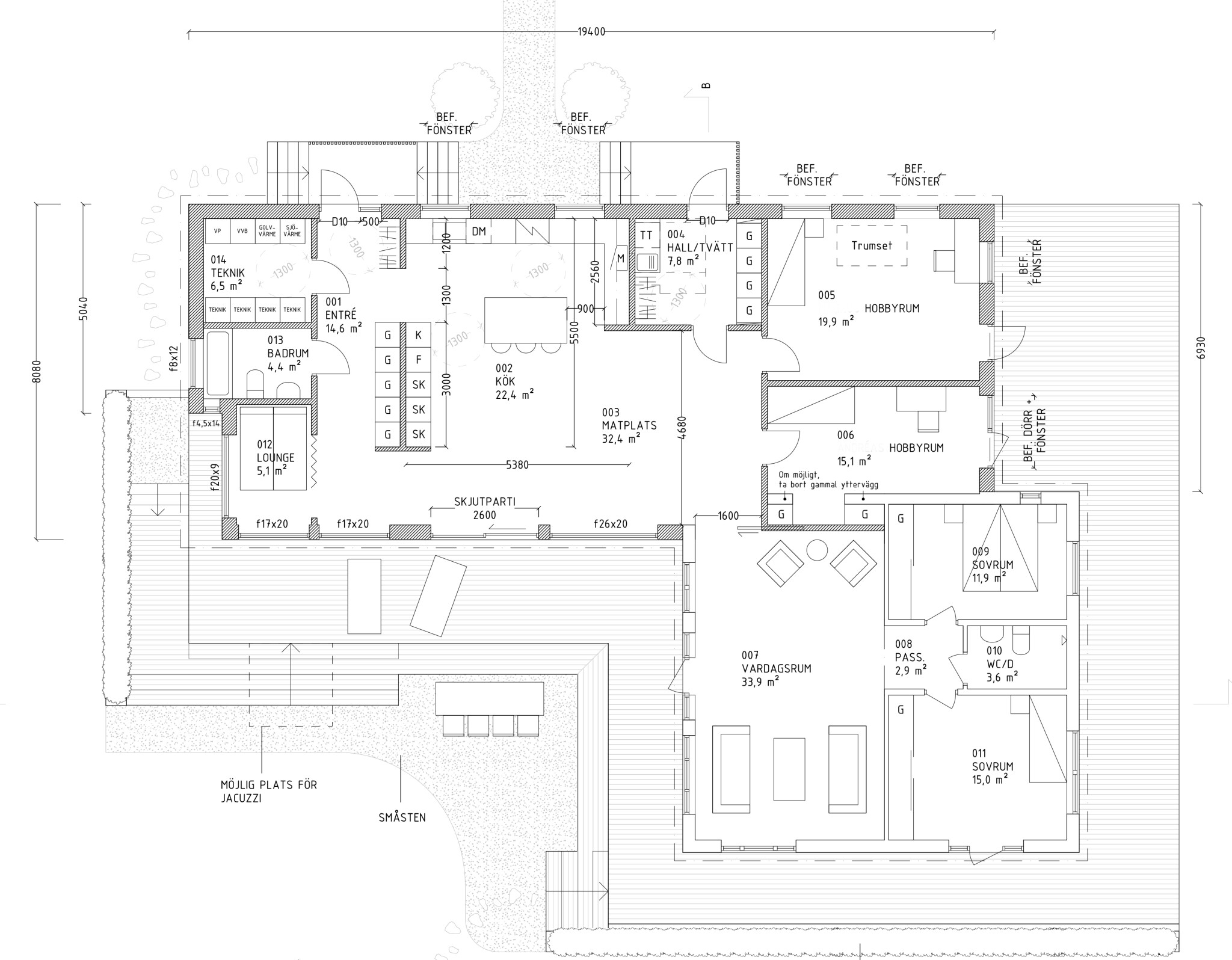 Den del vi har kvar från befintligt hus är vardagsrum (007), sovrummen (009 och 011) samt WC och passage däremellan. Hela den rektangulära huskroppen ovan är det som vi planerar bygga.