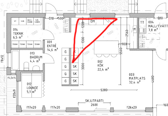 Tack för att du tar dig tid med synpunkter! Vi tänker nog ha en köksö (som blir en bra avställnings- och arbetsyta) men inte en som byggs ihop med köket utan i så fall köper vi en och ställer dit som inte är förankrad i golvet. Jag är medveten om arbetstriangeln och har tänkt att vi typ fått till den, se nedan skärmdump. Mellan arbetsyta, vask, spis, ugn och diskmaskin är det bra avstånd och lättarbetat. Men ja det är kanske lite för långt avstånd till kyl och frys. Jag gillar inte riktigt förslaget med högskåpen längs väggen mot tvättstugan för då försvinner den arbetsytan där. Att istället ha bänk med arbetsyta där kyl och frys är idag blir för långt bort. Jag vill inte ha vask och spis på en sida och arbetsbänk på andra så man spiller på golvet mat som ska flyttas mellan arbetsytan och vasken/grytan/avfallspåsen.BirgitS skrev: