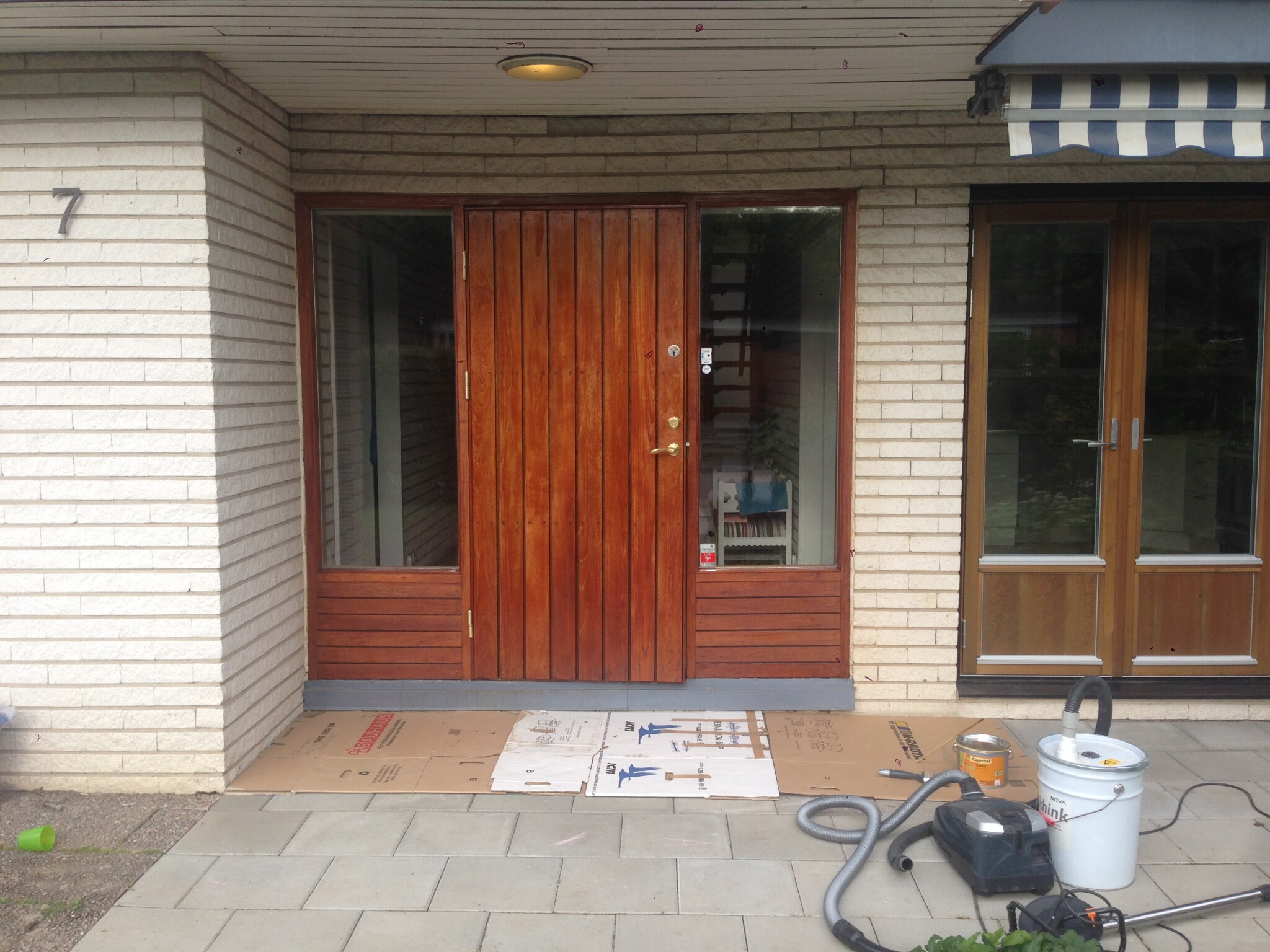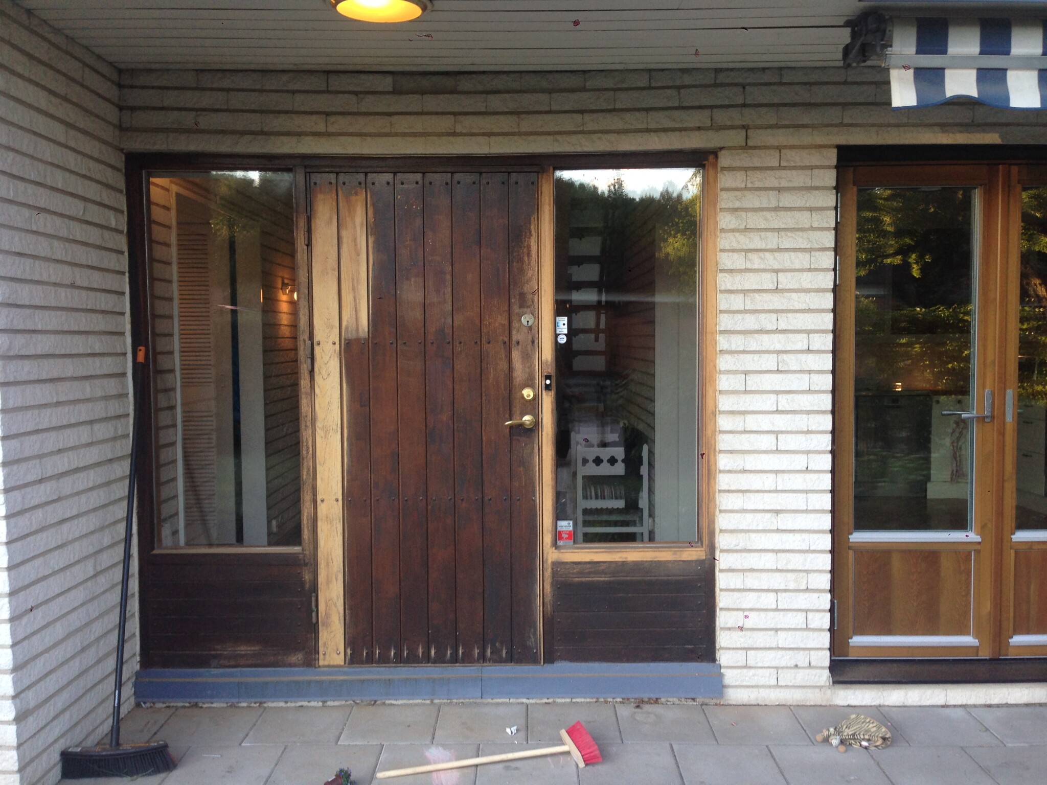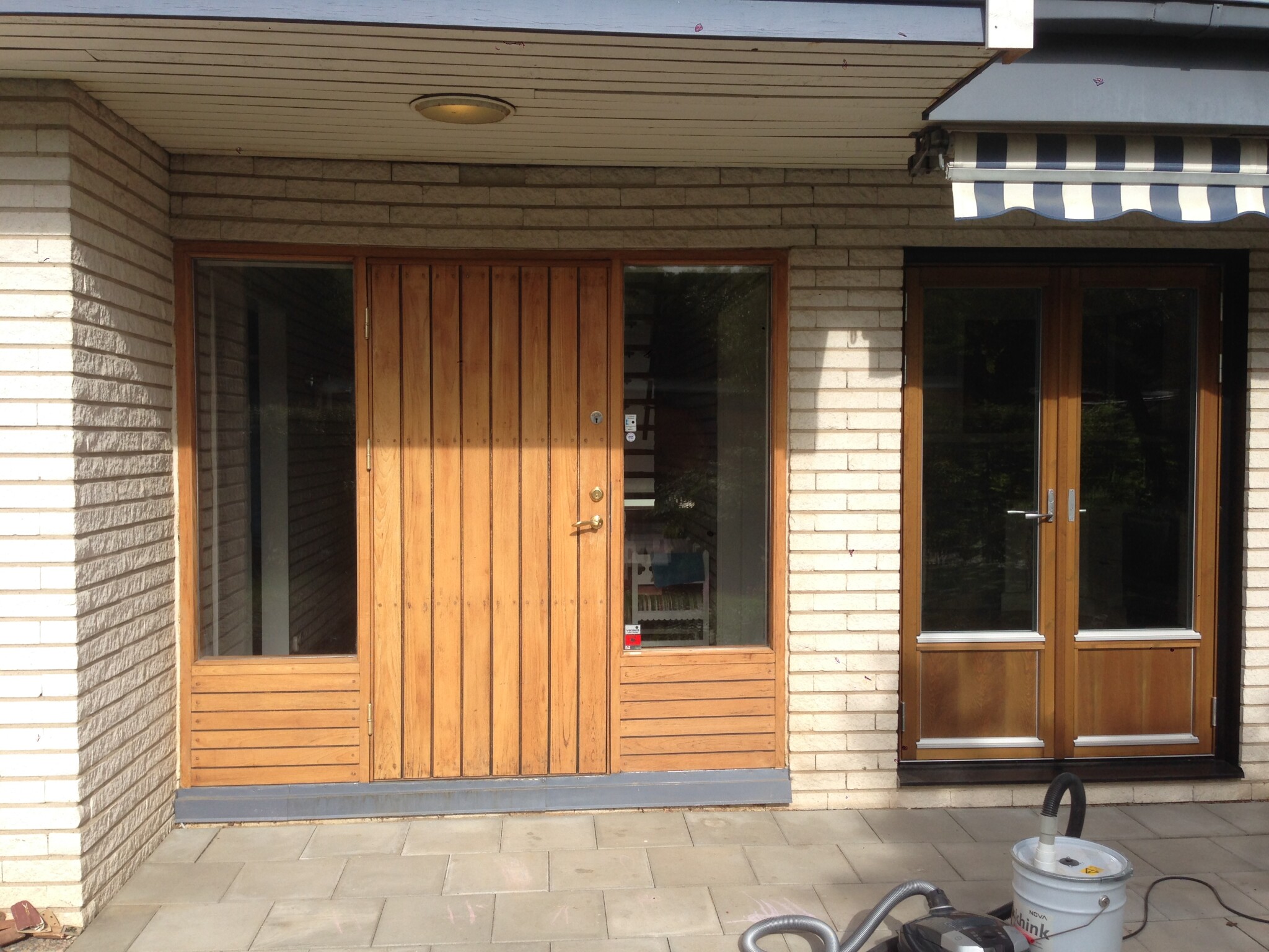 Hade en dröm om att kunna skrapa fram husets orginalfasad som var i ljusbrun mahogny(!!!) enligt dokument, men kanske mer likt teak när vi väl rev och såg att de matchade fönsterkarmar nere. Oavsett, ädelträ hela panelen. Det var bättre förr 😅. Den var dock övermålad med mörk bets ggr flera på 80-talet och sedan blå plastfärg sedan -92, så när jag började skrapa visade det sig att trät vittrat sönder så det var bara att ta bort. Hade det bara varit bets hade det klarat sig likt dörrar fönster nere som jag skrapade fram och oljade för något år sedan (se bild 3-5). All plåt också övermålad med blå färg och Blå/vitrandiga markiser till det. Allt i dåligt skick på ytan men allt under inklusive isolering i mycket bra skick förutom en del av trä på balkongen som fick bytas med ny limträbalk. Bild 2 innan markiserna kom upp.