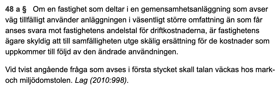 Lagen säger att du betalar för enligt det andelstal som fastigheten har fått enligt Lantmäteriförrättning. Du ska också ersätta skador enligt 48a § AL om du tillfälligtvis använder anläggningen mer än andelstalet ger uttryck för.Workingclasshero skrev: