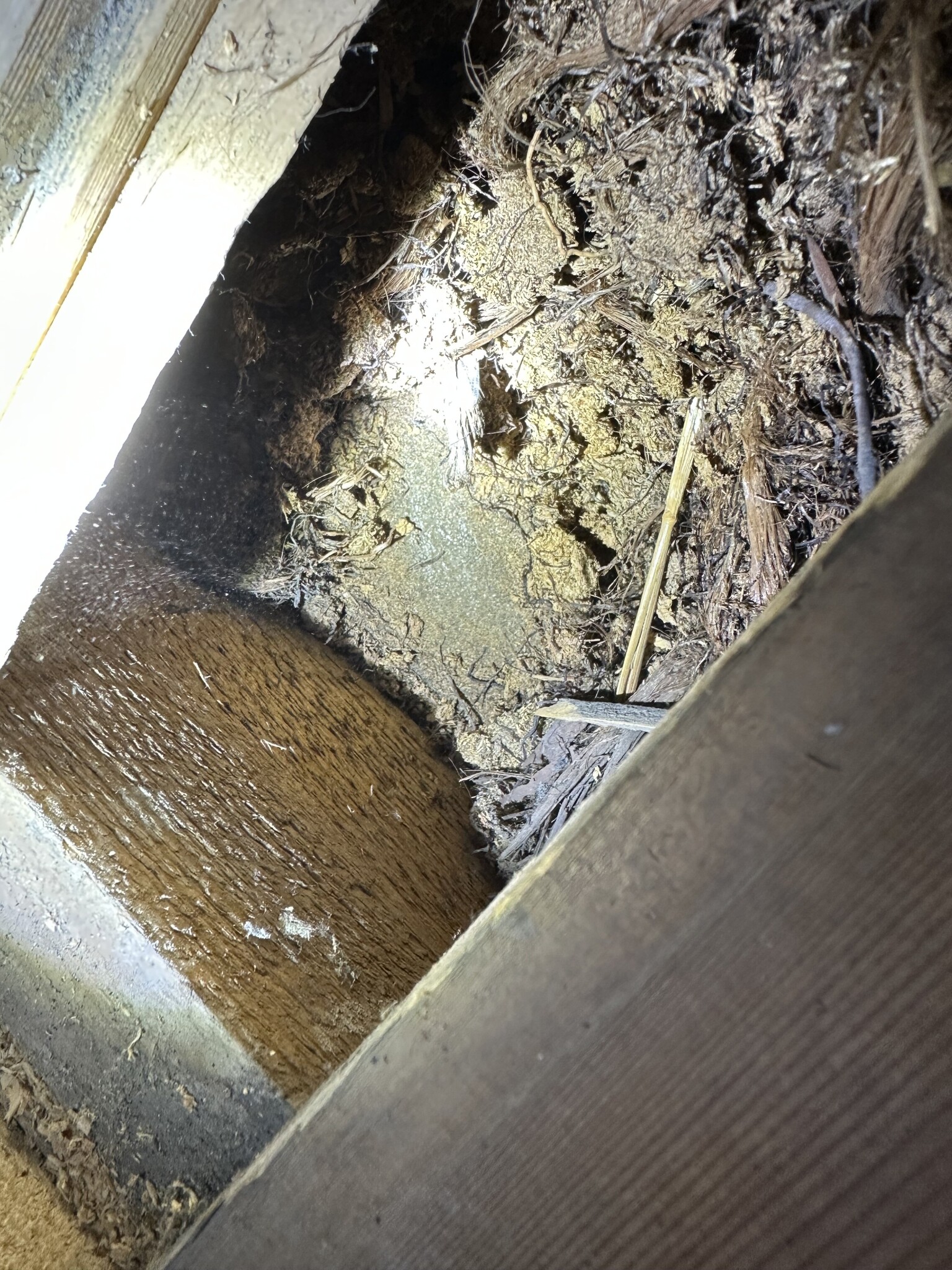 Tycks vara 10 cm ungefär av sågspån (eller vad det nu är), och i botten av det är det nåt som kändes som typ takpapp.