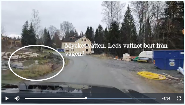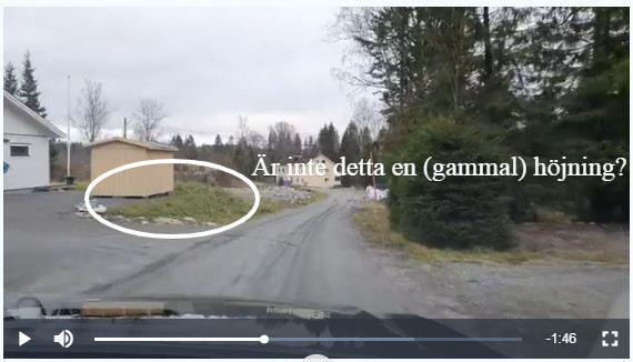 Efter höjningen ser jag ett sämre avsnitt mellan 1:08 och 1:29. Man ser tydligt att orsaken är för mycket fukt i överbyggnaden, och det börjar när skogen slutar på vänster sida och det kommer ett relativt nytt hus, som delvis höjde tomten. Man ser ett litet dike med trumma under uppfarten. Därefter kommer det en fastighet med bergkross på på höger sida och ett annat hus som hålls på att bygga på höger sida.