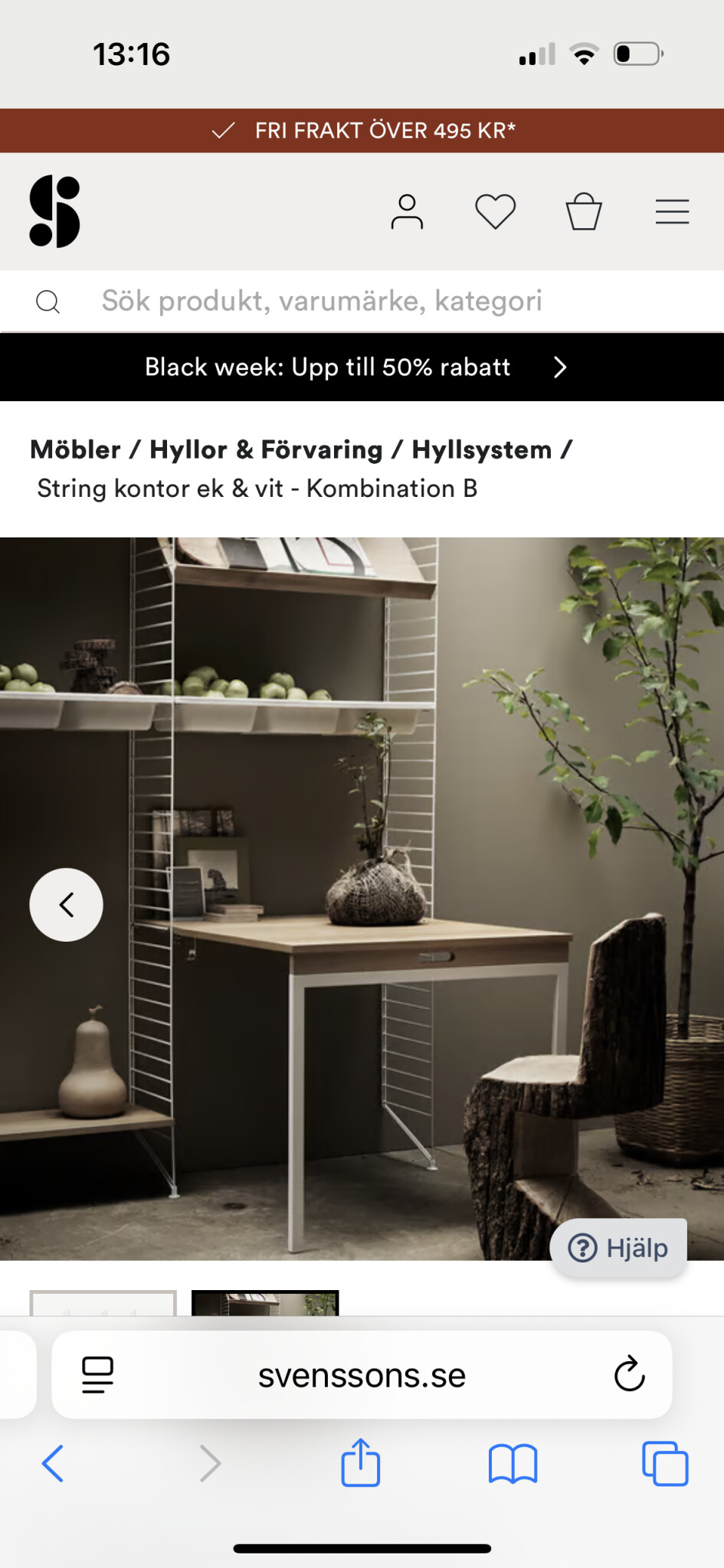 Tack för detta tipset!P Pettman skrev:[länk] hade för många år sedan en sekretärtillsats till sina hyllor (jag har en mina föräldrar köpte när jag var liten) men den verkar ha gått ur sortimentet. Den är iofs i lägsta laget för att stoppa in en skärm i. Det kanske går att få en tillverkad om man hör av sig till dem. Kan i alla fall upplysa om att klaffbeslagen i den har hållit fint i typ 30 år där den periodvis använts som dagligt skrivbord vid hemmajobb, symaskinbord och diverse annat genom åren. Deras hyllstegar och luckor kanske kan vara en bra utgångspunkt för ett bygge, alternativt kan du ju alltid fråga om de kan damma av ritningen till klaffen och tillverka en åt dig.