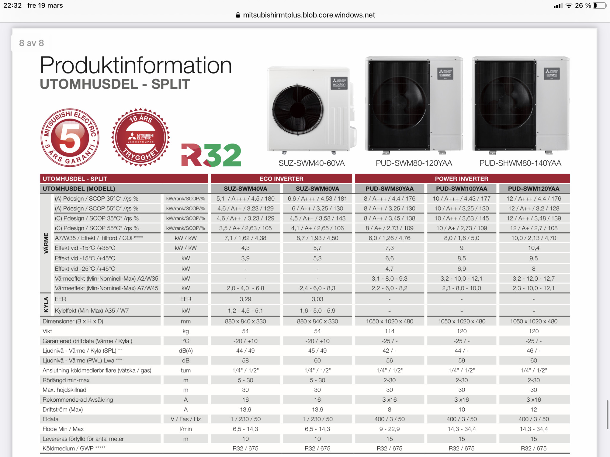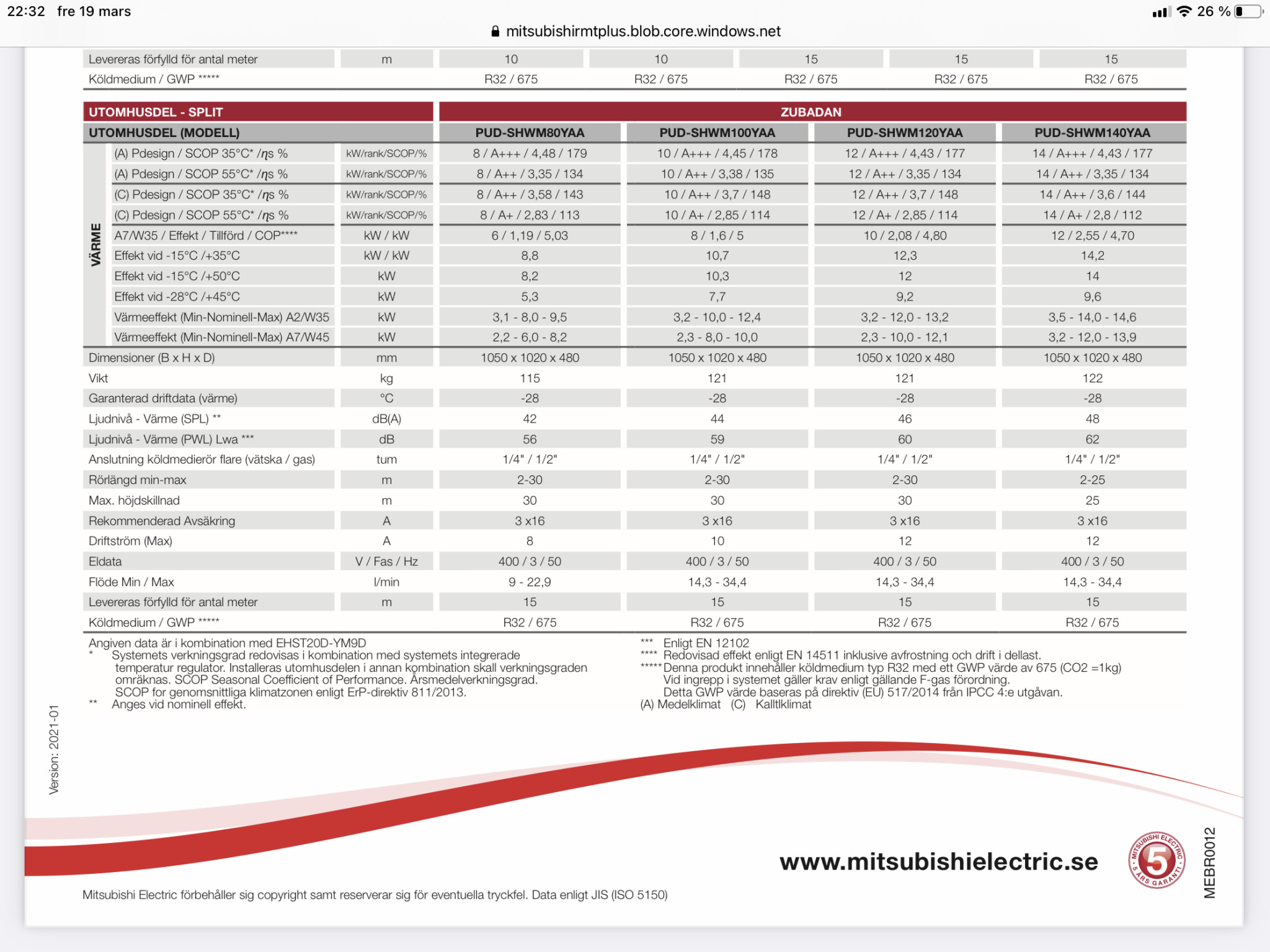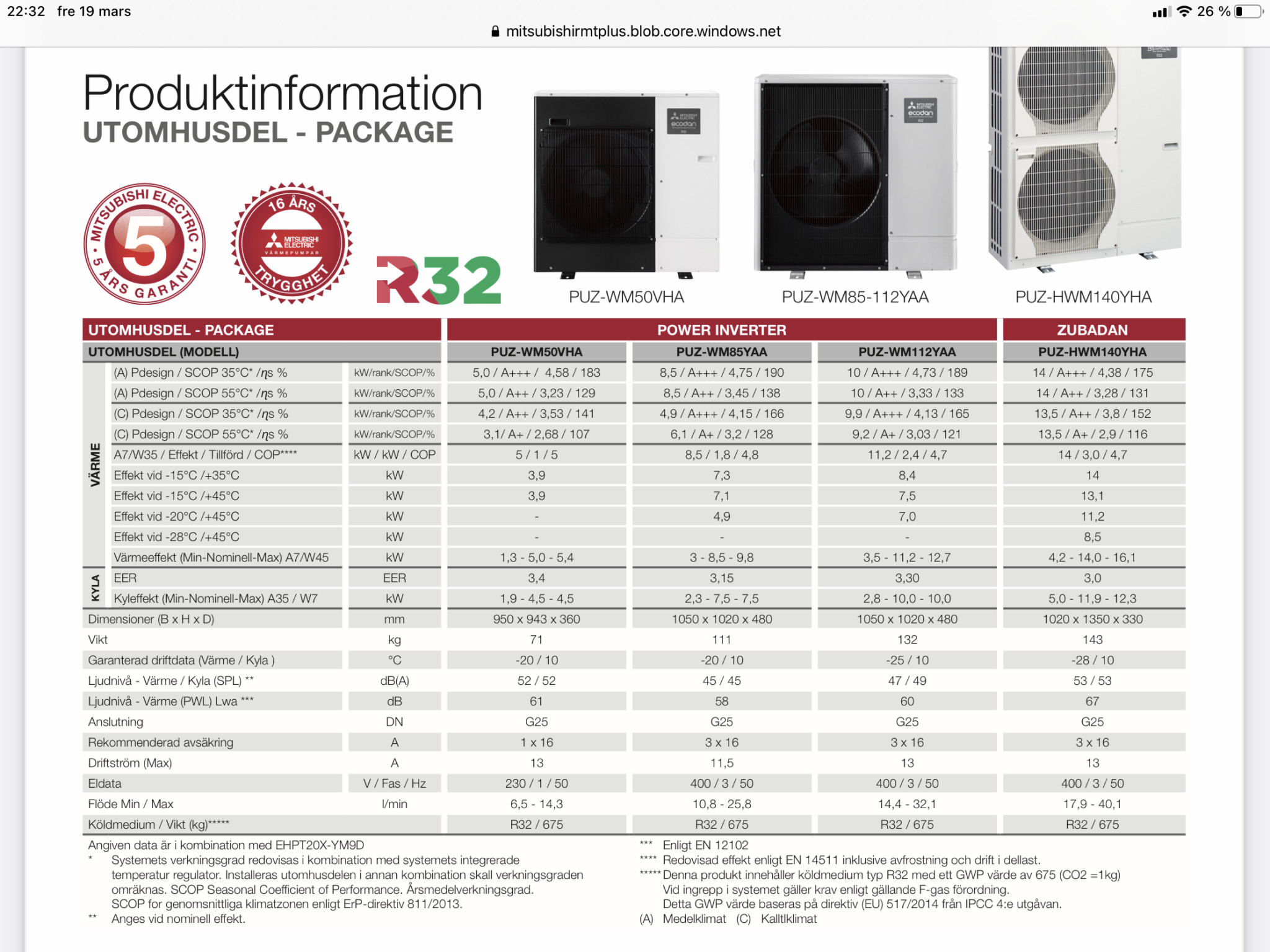 Edit såg nu att mitsun var package modellen som de andra så den har sämre scop och cop men bra effekt neråt (men såklart bättre än gas varianterna). Finns det några siffror på en wm85 med vatten ut vid minus -7?