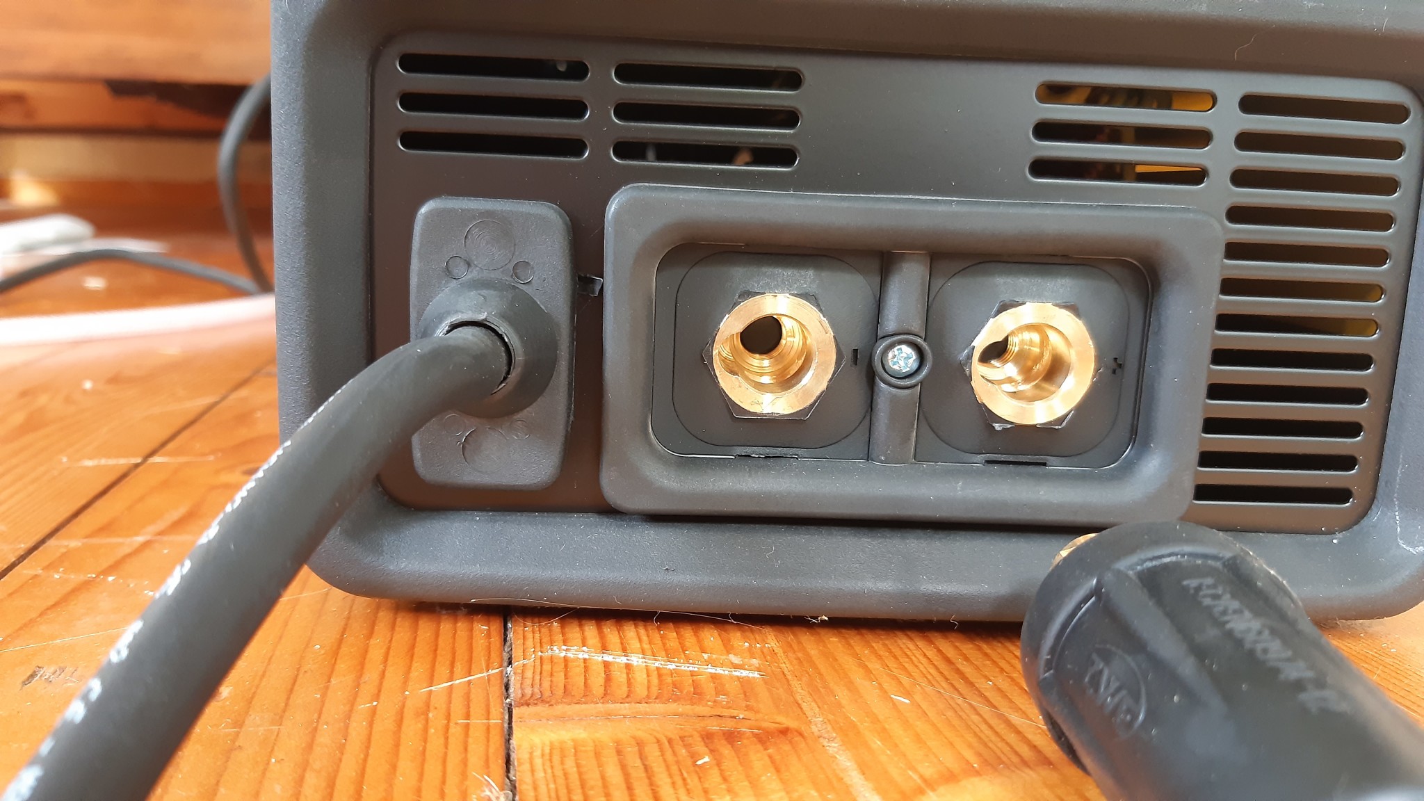 - den kontakt som kommer ut från maskinen som dom i bruksanvisningen kallar för "GAS/NO GAS cable connector" till uttaget märkt med minus (uttaget till vänster)