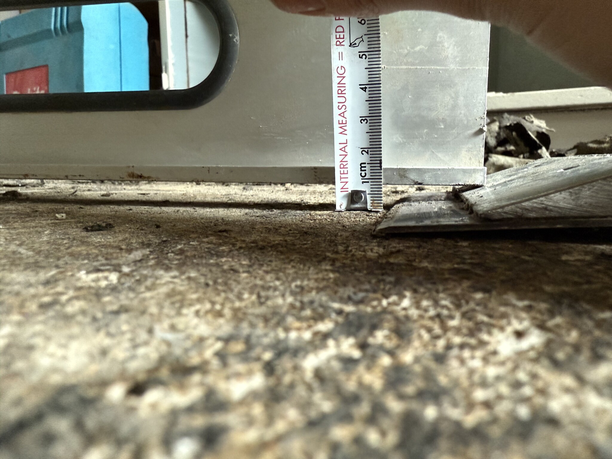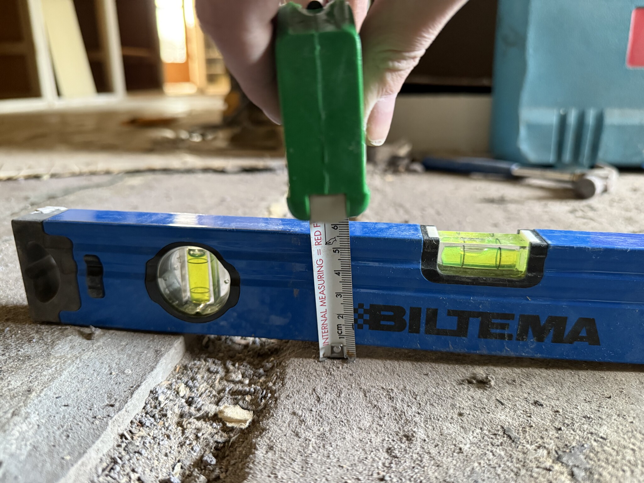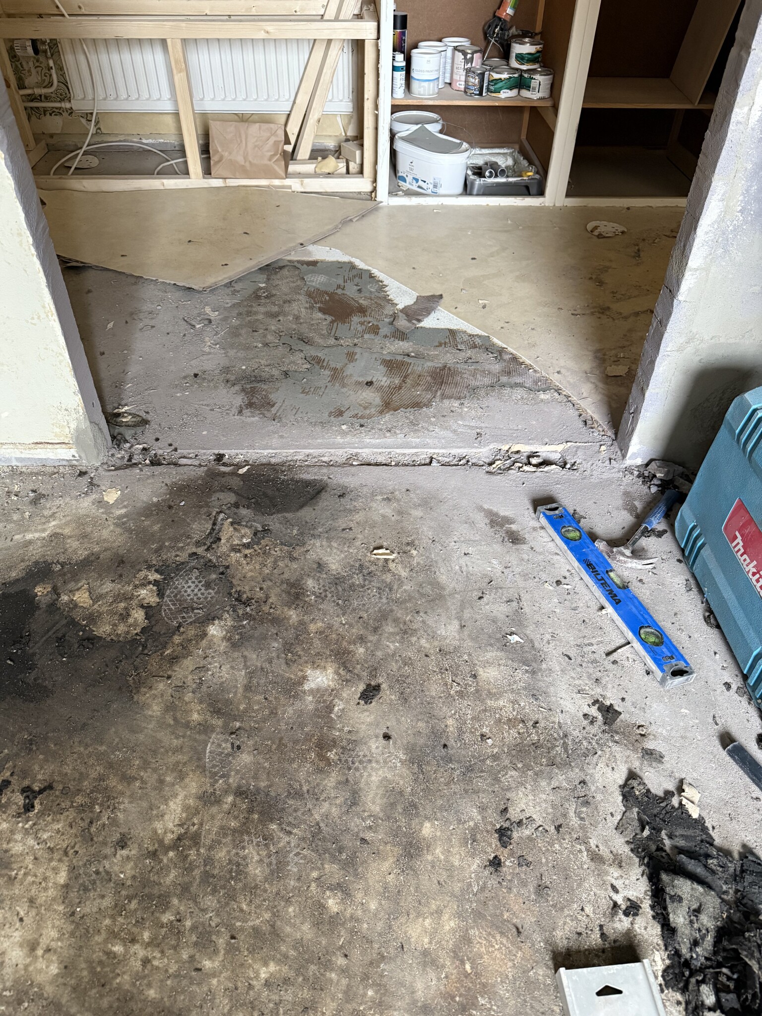 Fanns ett dörrkarm som jag tog bort. Tröskeln satt tyvärr fast i golvet, mellan köket och hallen, så när den rök blev det ett mellanrum på ca 5cm. Hallgolvet är 7mm högre än i köket. Sen fortsätter golvet slutta mer och mer i köket, ca 1,5 cm. Vilket kanske inte gör något. Men hur gör jag vid tröskeln, vill INTE sätta dit en ny.