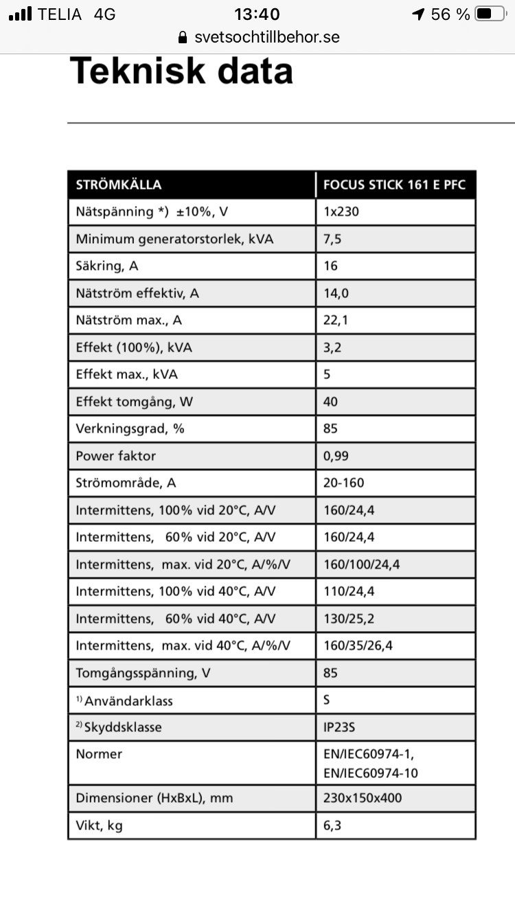Nej, 20A är inte rätt. Jag vill se var det står specificerat. Men brukar med pinne som är den mest effektkrävande processen generellt klara sig utmärkt på 16A på 200A.S Stefan1972 skrev: