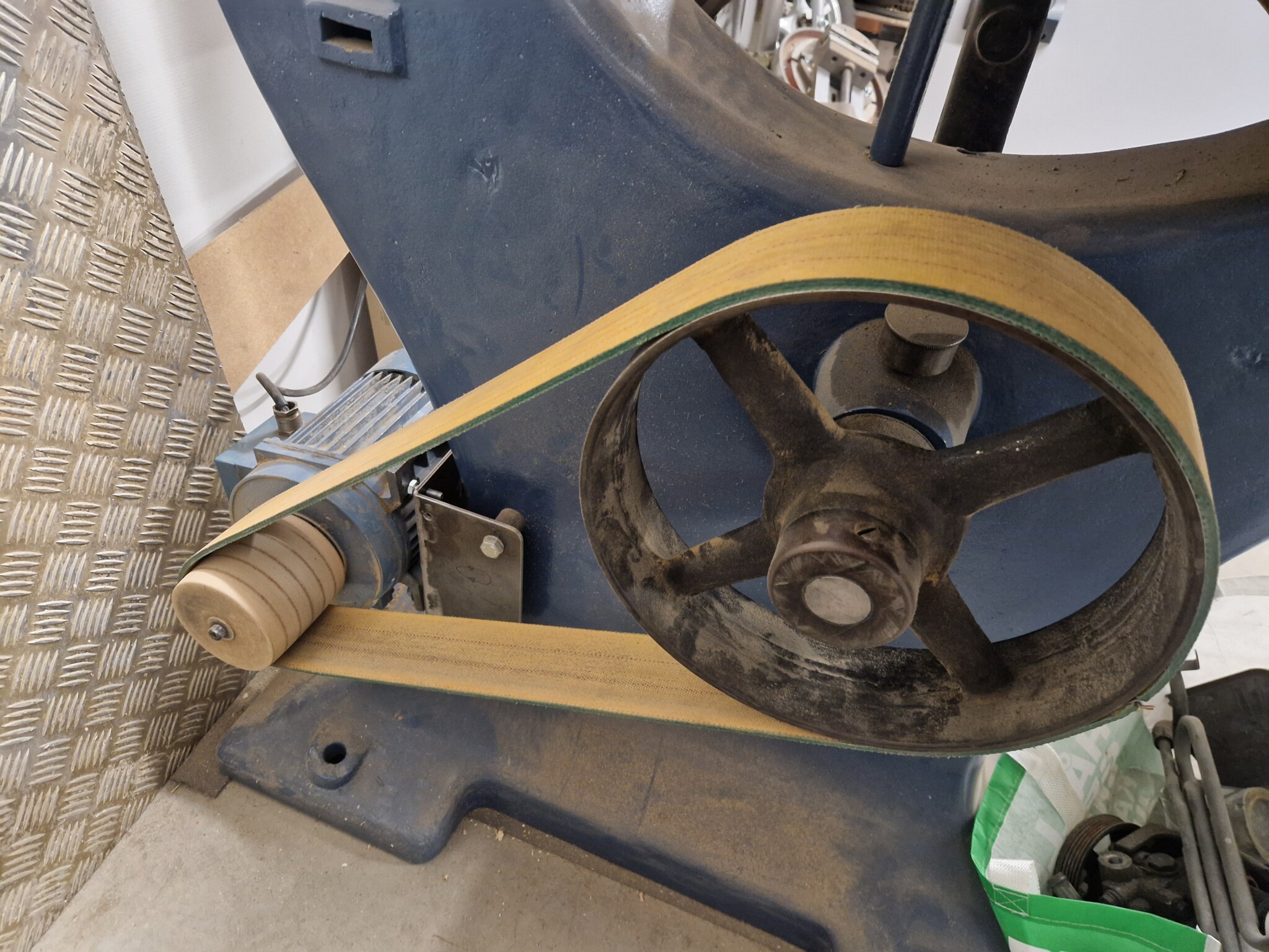 Konvertering till dubbla kilremmar kostar tyvärr mer för mig än en begagnad och fungerande märkesbandsåg, har väldigt begränsade möjligheter till att åka och fynda på skroten... och det finns inte ett enda kullager i sågen, den tillverkades runt år 1900 😀