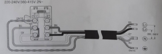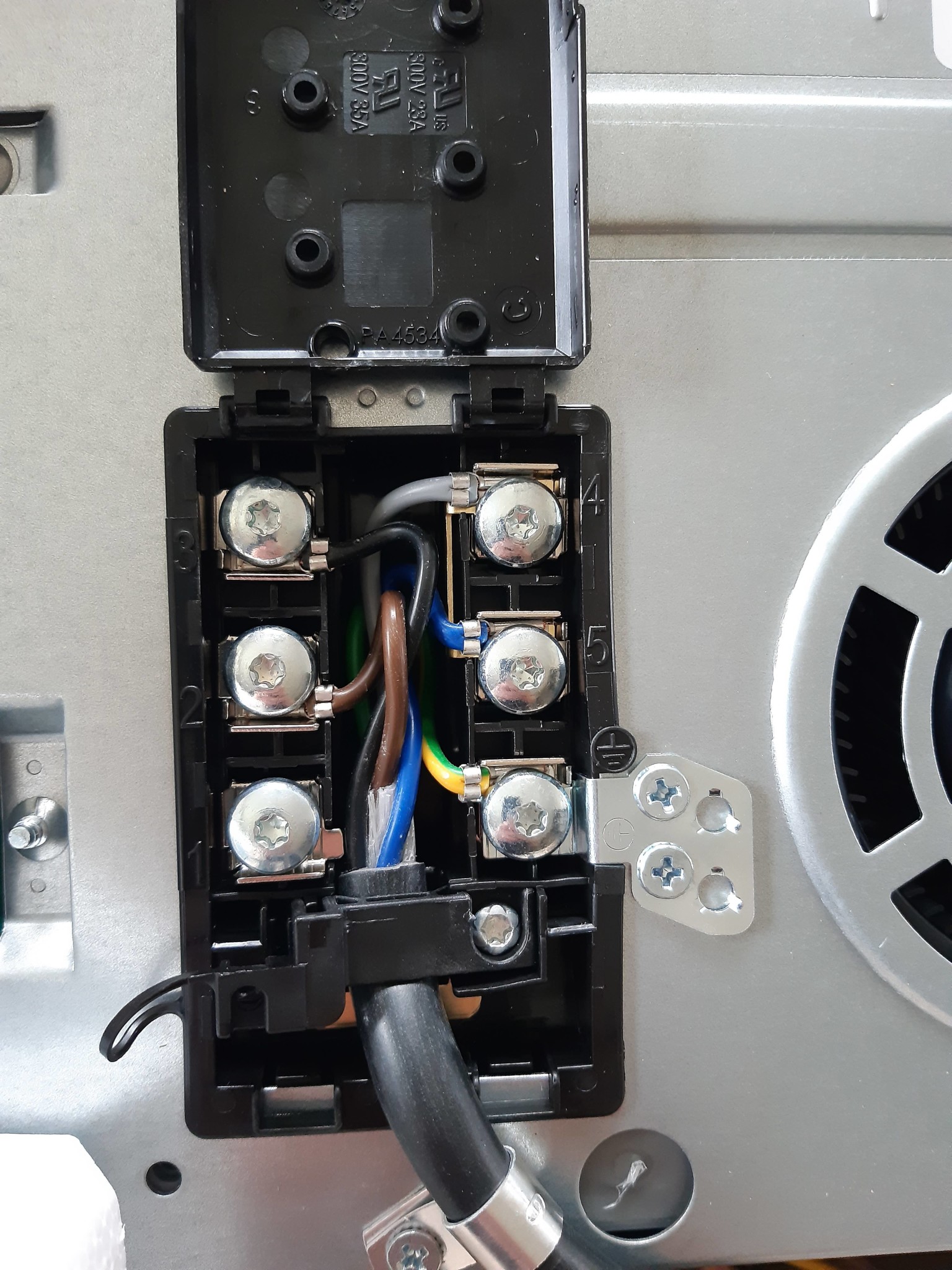Nu återstår bara att koppla in den rätt i den dosa du har utan att behöva gissa. Man kan anta att grön/gul är skyddsjord och mäta att blå är nolla och de andra tre faser. Eller så kan man titta på hur den gamla hällen var inkopplad om du kommer ihåg det. Det kan ju vara bra att använda samma två faser eftersom det uppenbarligen har fungerar utan att mätarsäkringar löser ut.