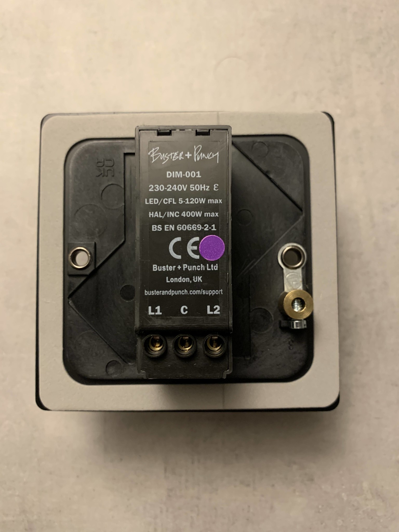 Dimmern passade inte i ABB dosan, egentligen inte i spårdosan heller, men med lite modifikation så går det att få in den. Det man får modifiera är jordplinten, den har de monterat annorlunda på dimmern (av någon ologisk anledning), men den går nog att vrida på om man filar bort plastbiten som låser fast den i sidled.