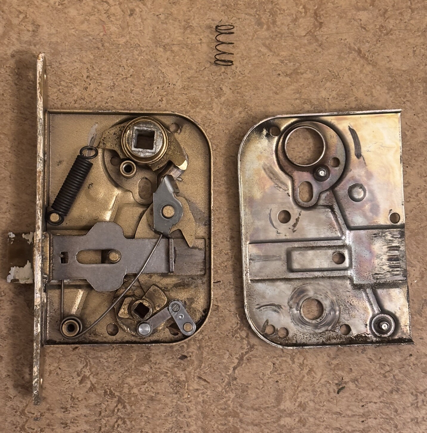 Men nu får jag inte ihop kistan som det var ens. En glest vindad tryckfjäder sprang ur när jag öppnade och jag kan inte förstå var den ska sitta. Den silvriga kappan som ligger an mellan mässingsdetaljen som handtaget frider och mekanismen som drar tungan in sitter löst och hela mekanismen går i baklås efter ett par tryck.