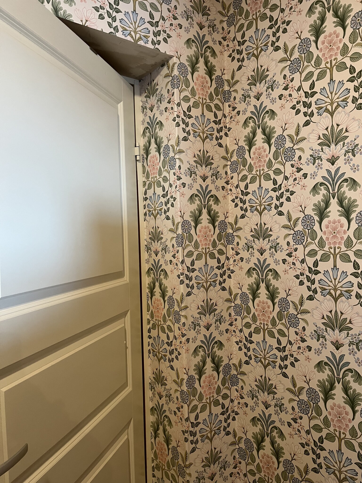 Man ska inte ha för. bråttom! Brukar dock gå lite snabbare för maken o tapetsera.. men jag har en känsla av att där han tapetserade nu.. bara den lilla biten.. kommer i slutänden ha tagit lika lång tid som övriga väggar i hela lgh sammanlagt typ(vinklar o vrår o snetak.. och så mönsterpass såklart)