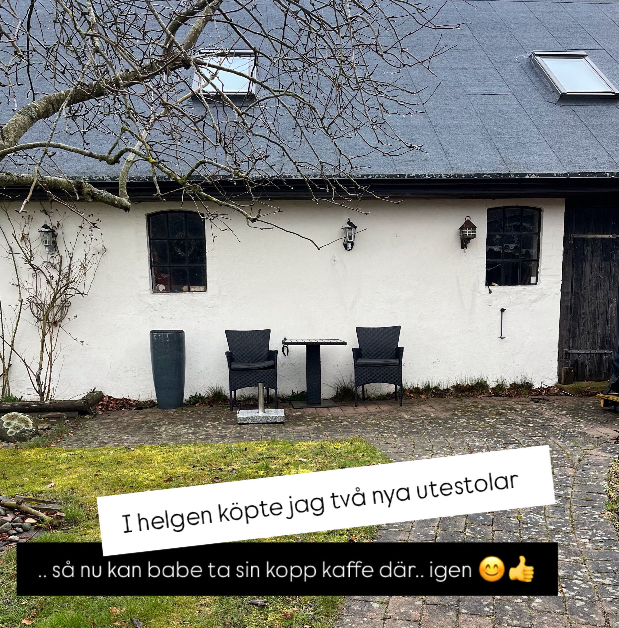Shoppade två stolar i helgen.. och tog ner bordet från "andra balkongen".. så nu fick vi åter igen en sittyta vid logväggen.. där babe gärna njuter av vårkaffet (varmaste/soligaste stället på innergården).