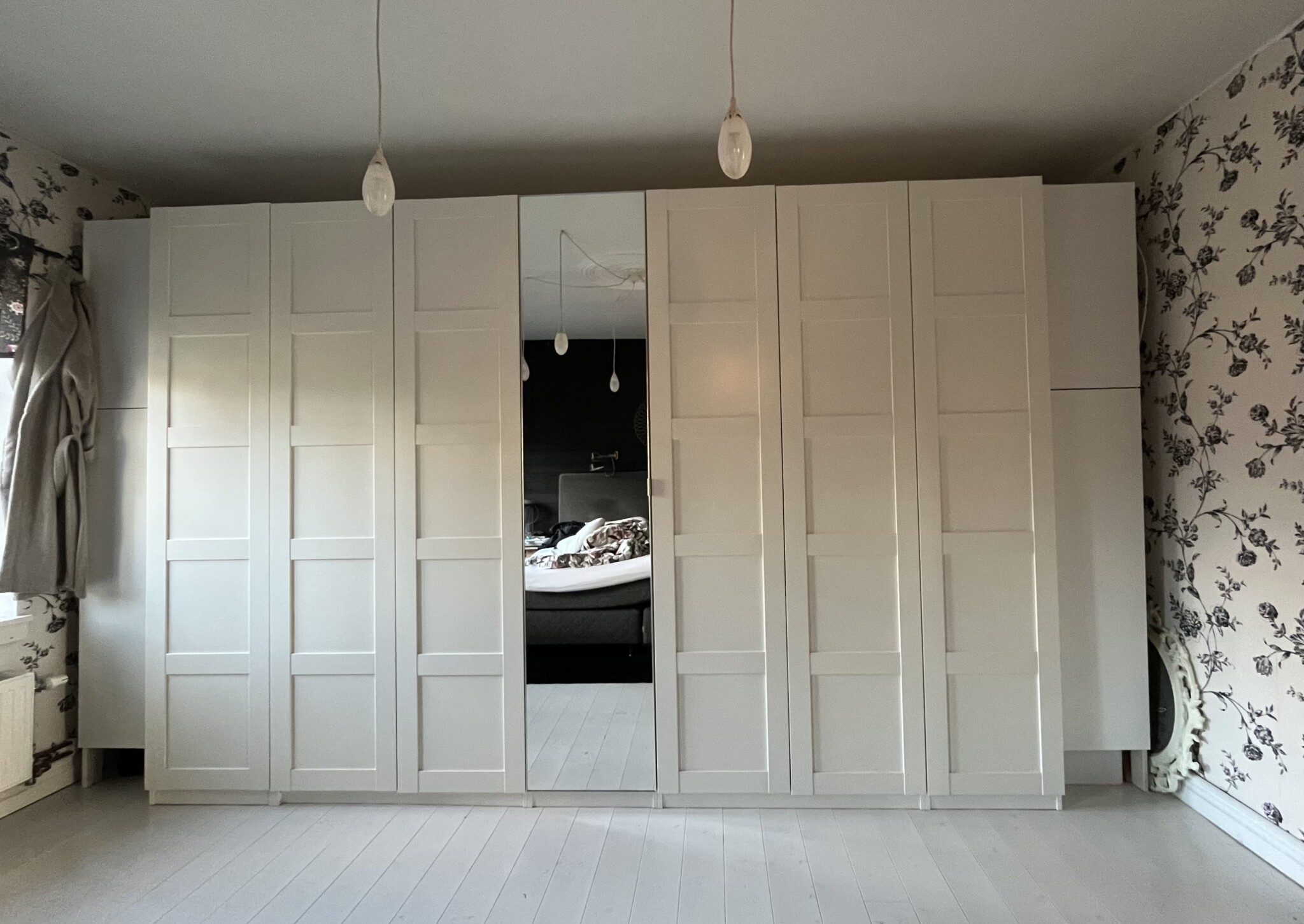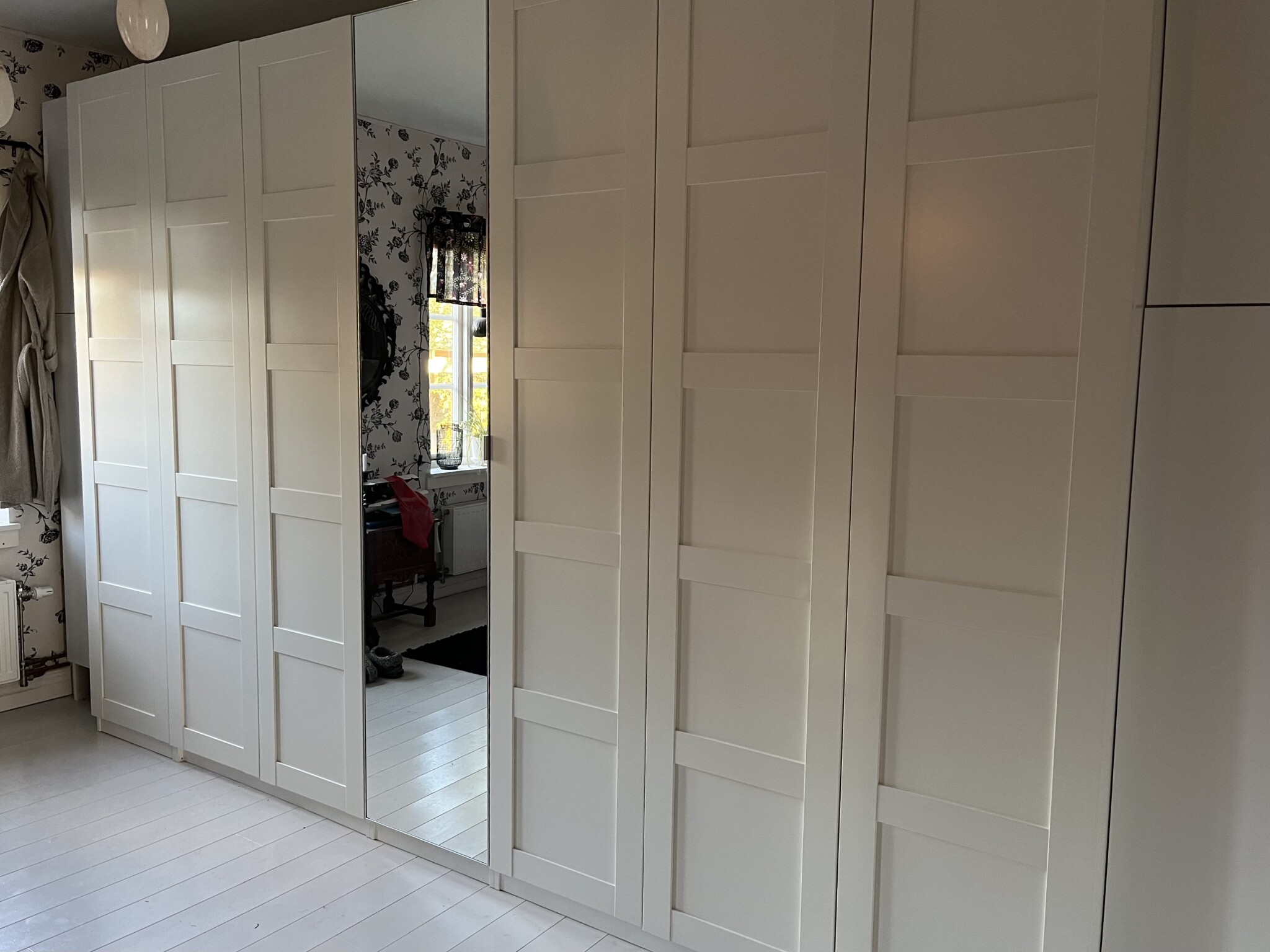 Mycket nöjd med valet av dörrar - inkl att jag fick för mig att ta en spegeldörr på mitten (har många ggr saknat en helkroppsspegel..). Blev bra tycker jag!