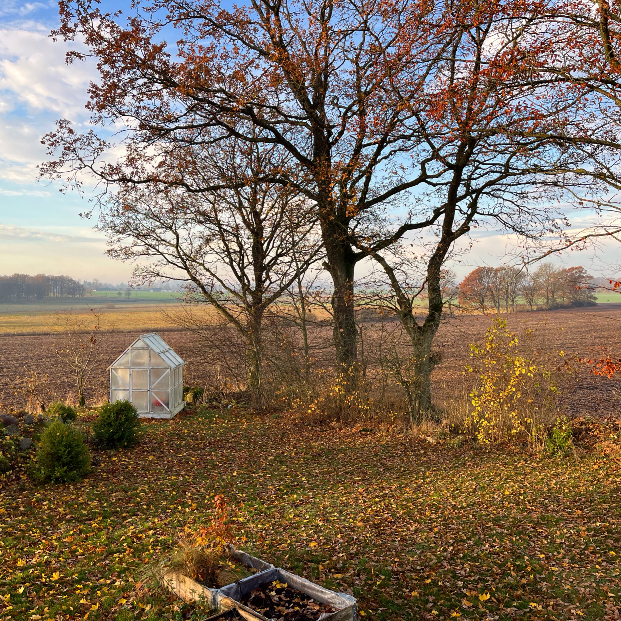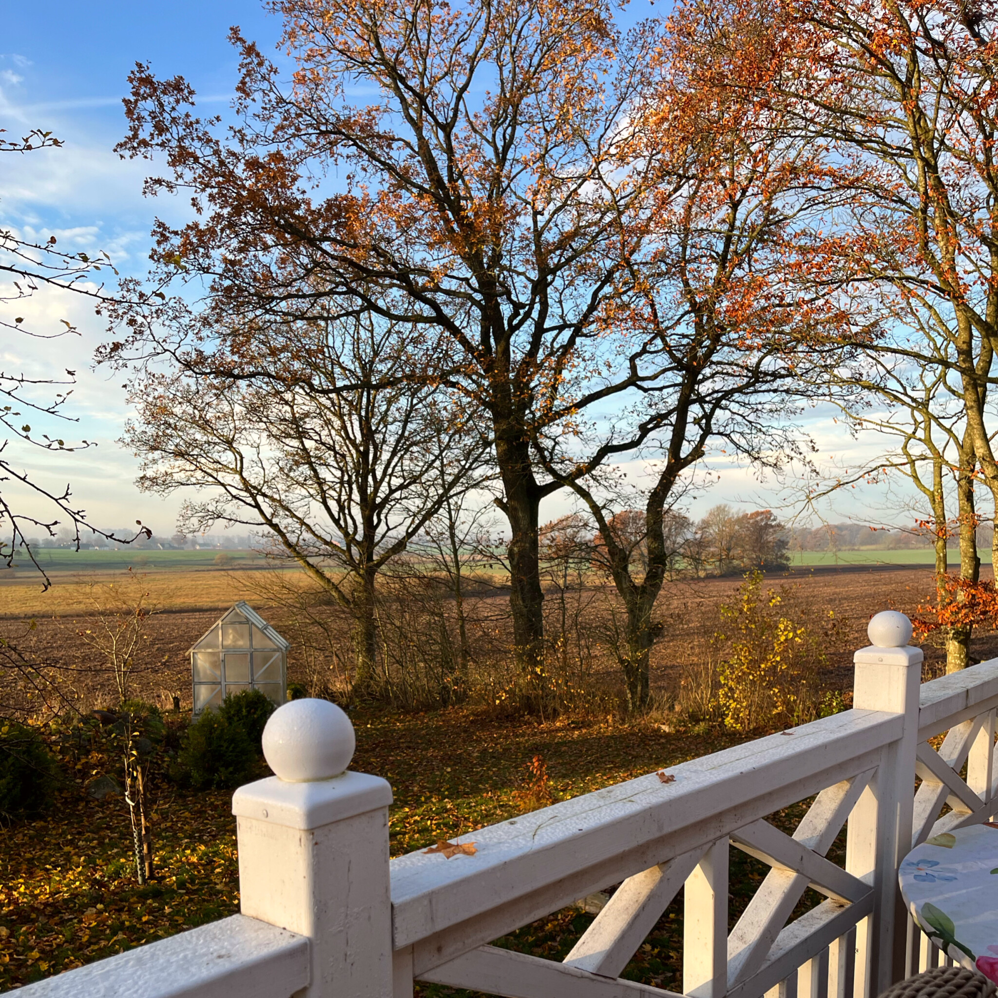 Lite höstigt från balkongen 🍁 vackert.. glad att jag hann få en jä*kla soldag medan gården hade lite löv kvar.. med färg‼️ (var rädd att allt skulle hinna falla..)