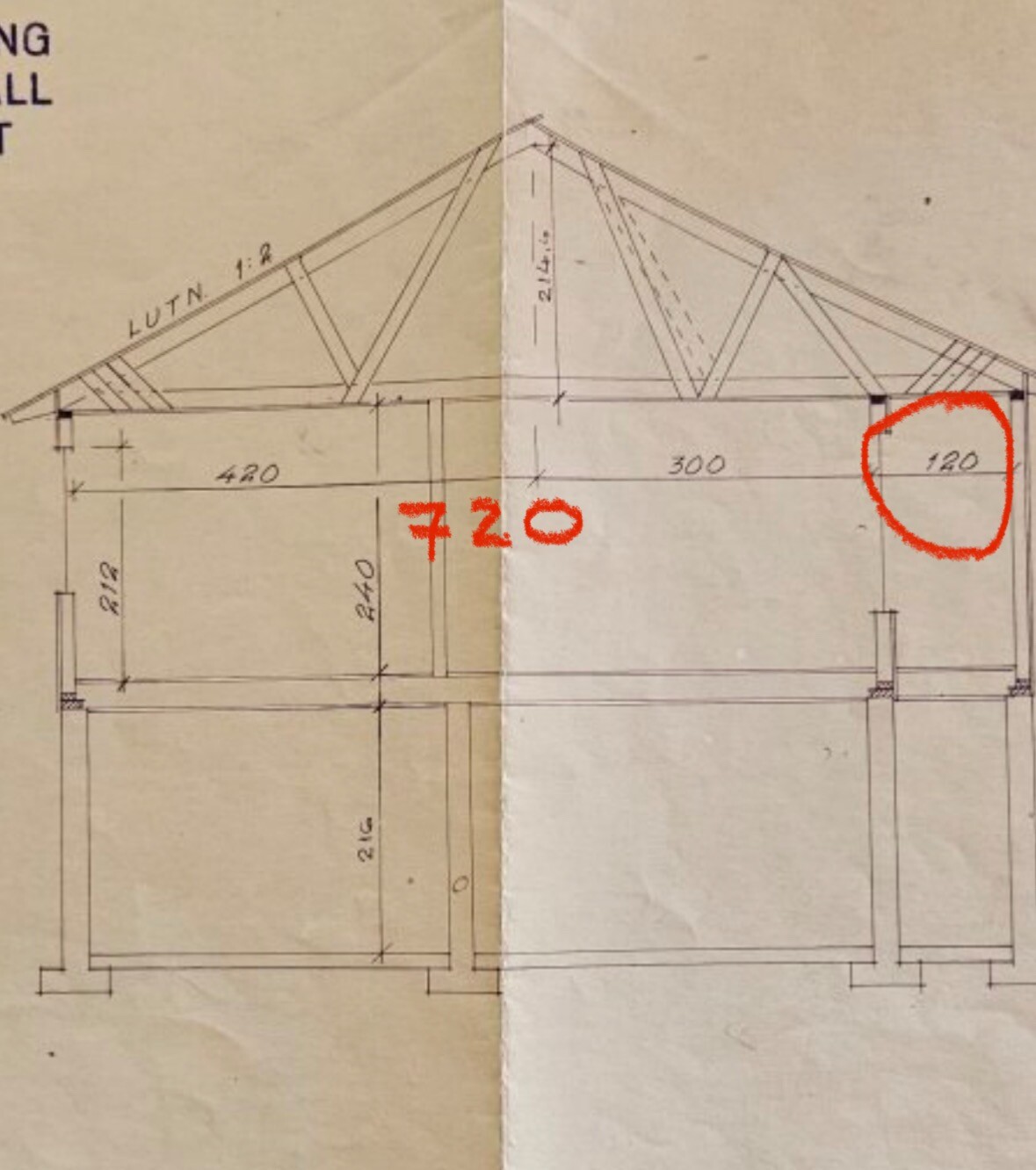 I köksdelen är huset 720 brett, det finns en bärande vägg ungefär i mitten. I den bredare delen av huset är det istället 720+120, dvs 840 brett. Här sitter förmodligen två bärande väggar…