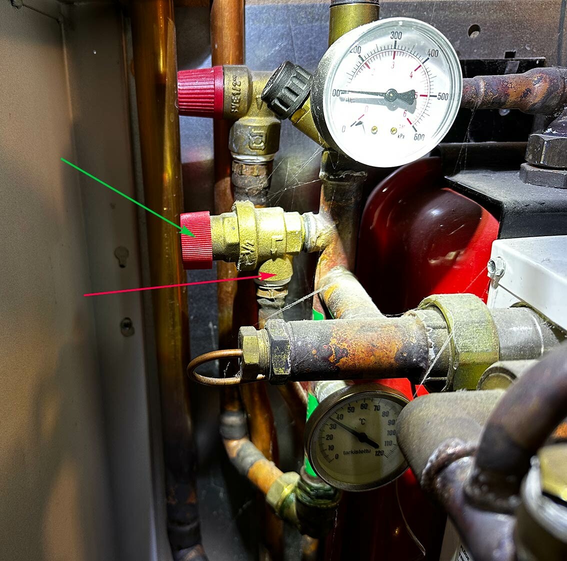 Kan det vara säkerhetsventilen, markerad med grön pil, som blivit sliten? Eller ska jag börja söka efter källan till eventuellt övertryck i systemet? Jag ser dock inget uppenbart konstigt på mätaren. Allt annat funkar normalt. Varmvattnet i dusch och köket etc funkar normalt.