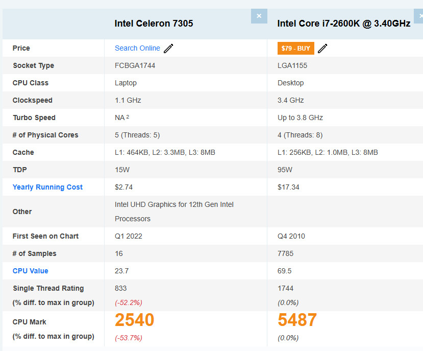 https://www.cpubenchmark.net/compare/4762vs868/Intel-Celeron-7305-vs-Intel-i7-2600K