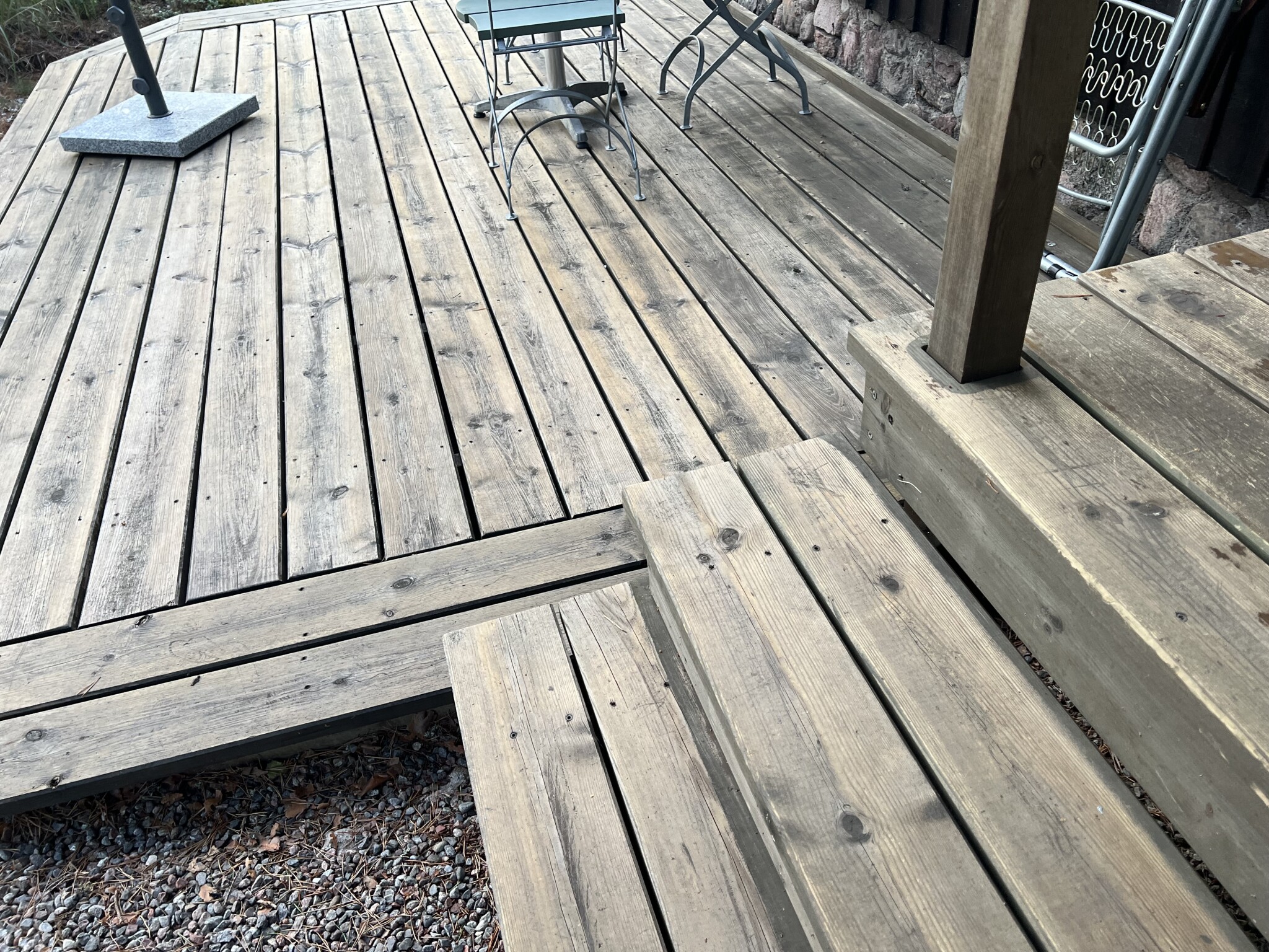 Vi har ett par altaner på sommarstugan som har tillkommit under olika år. Nu har de börjat se skitiga och kladdiga ut så svågern tog med Kärschern och körde igång. På hans altan blev det rent och prydligt med samma svärta som tidigare, riktigt snyggt. På min altan, som är den senaste, blev det i stället trärent, gult, fult, med synliga spikskallar och kvisthål. Augustidepp direkt. Antar att de ursprungligen blivit helt olika behandlade. Hur har de behandlats, och vad gör jag nu?