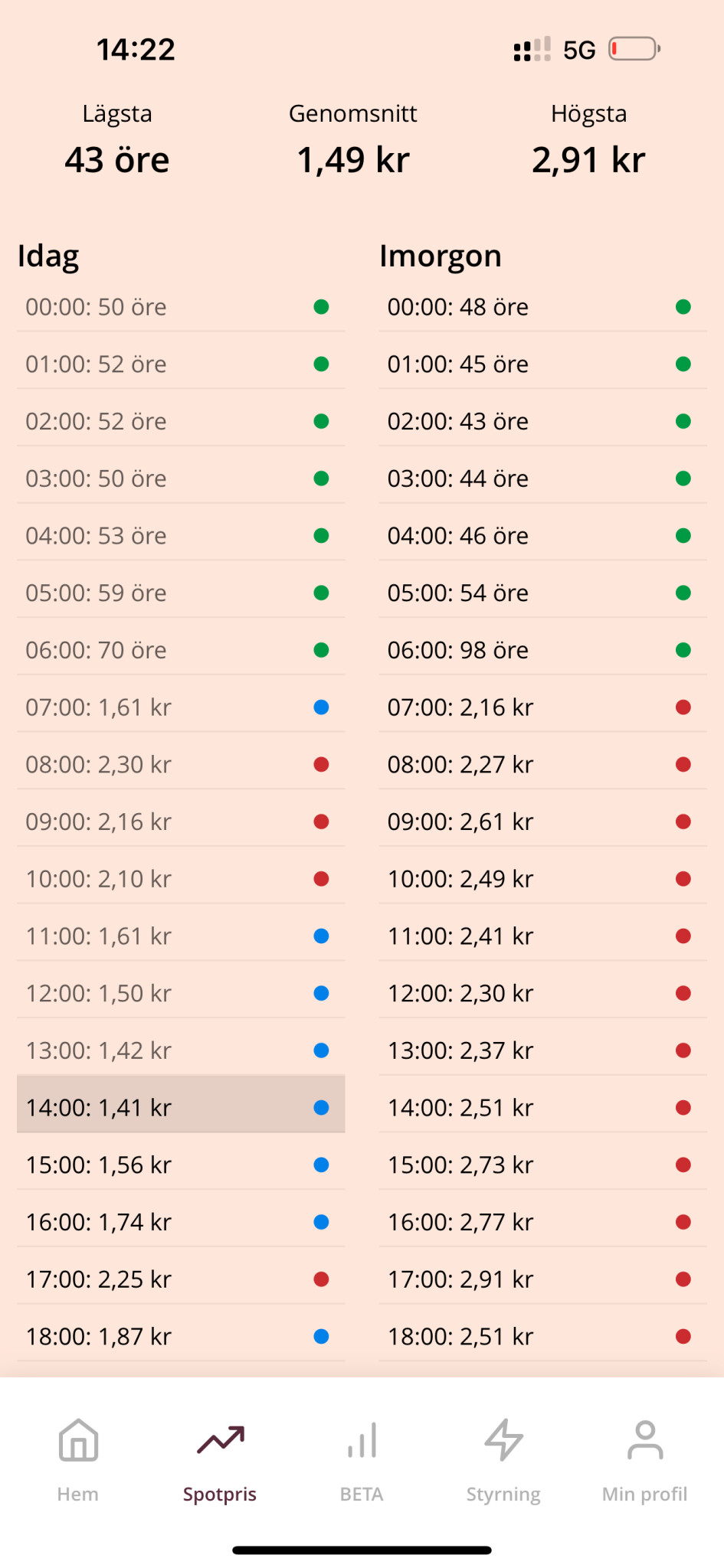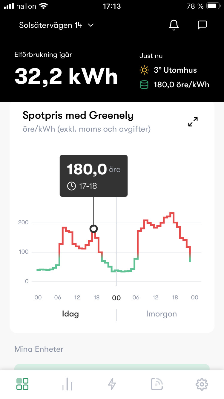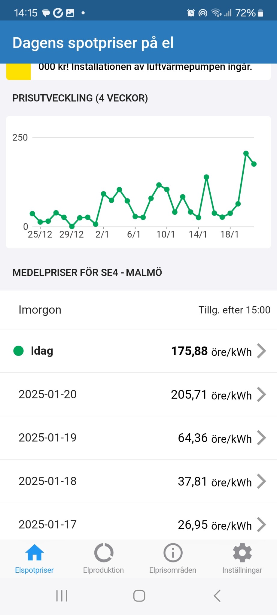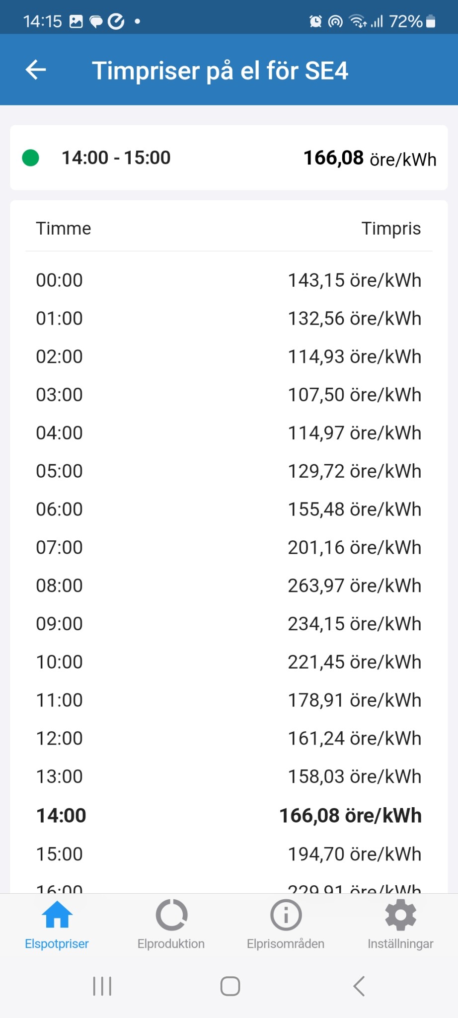 Visst, jag kan väl hålla med om att det inte blir lika snyggt i en mobil som en app, men både grafen och tabellen är ju precis lika informativa. Den sparar väl ändå inställningarna så om du går in på sidan så ser du senaste dagens priser med dina tidigare inställningar. Sedan är det ju inte en särskilt komplicerad omvandling - det anges kr/MWh och dela det med 1000 så har du kr/kWh. Men prova som tipset ovan att se om elleverantören har något vettigt i sin appA Alexn72 skrev:Jag måste leta runt på sidan och klicka i rätt område samt rätt dag och sen lite huvudräkning om 300 per megawatt blir 30 öre över 300öre.