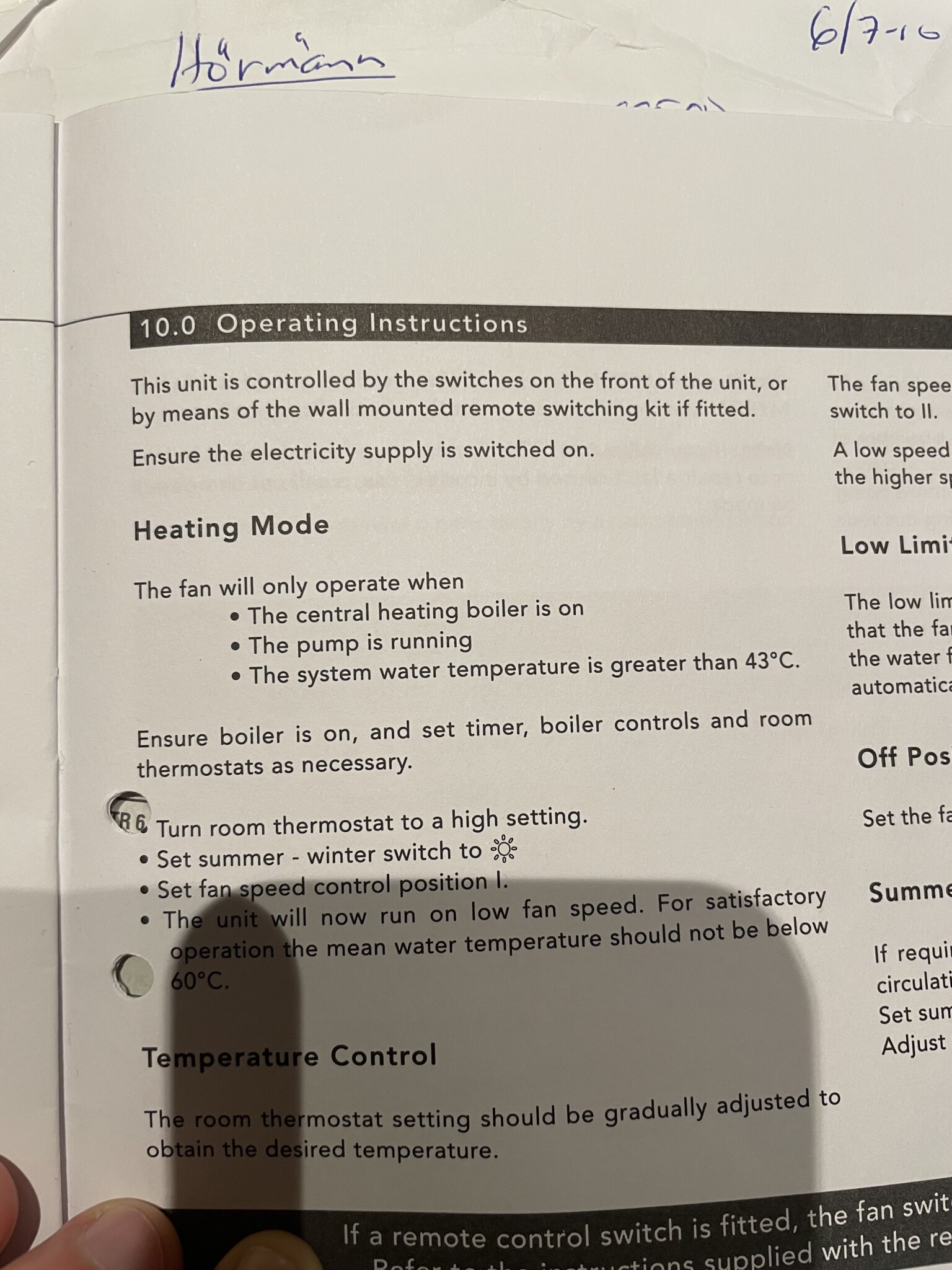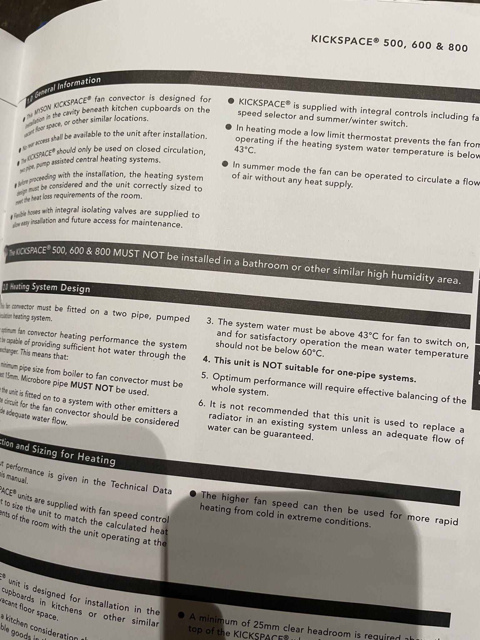 "The system water temperature on the return of the KICKSPACE® must be above 30°C for the fan to switch on* *Eg. When the mean water temperature is greater than 30°C the fan will switch on, then when the water temperature drops below 30°C the fan will switch off. Performance will depend on the water temperature at the coil and the flow though the coil."